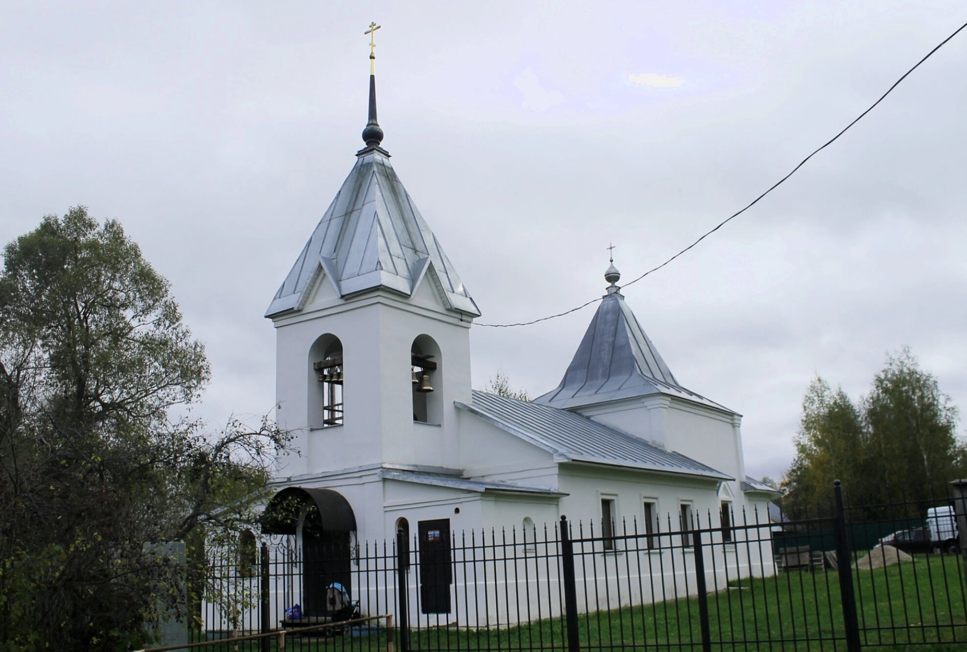 Храм окружает ухоженная территория, ограждённая кованой оградой. Он живописно расположен среди полей и лесов Подмосковья, что создаёт особую атмосферу умиротворения и молитвенного сосредоточения. Фотография передаёт не только архитектурные формы храма, но и его духовную значимость как центра православной жизни в округе.