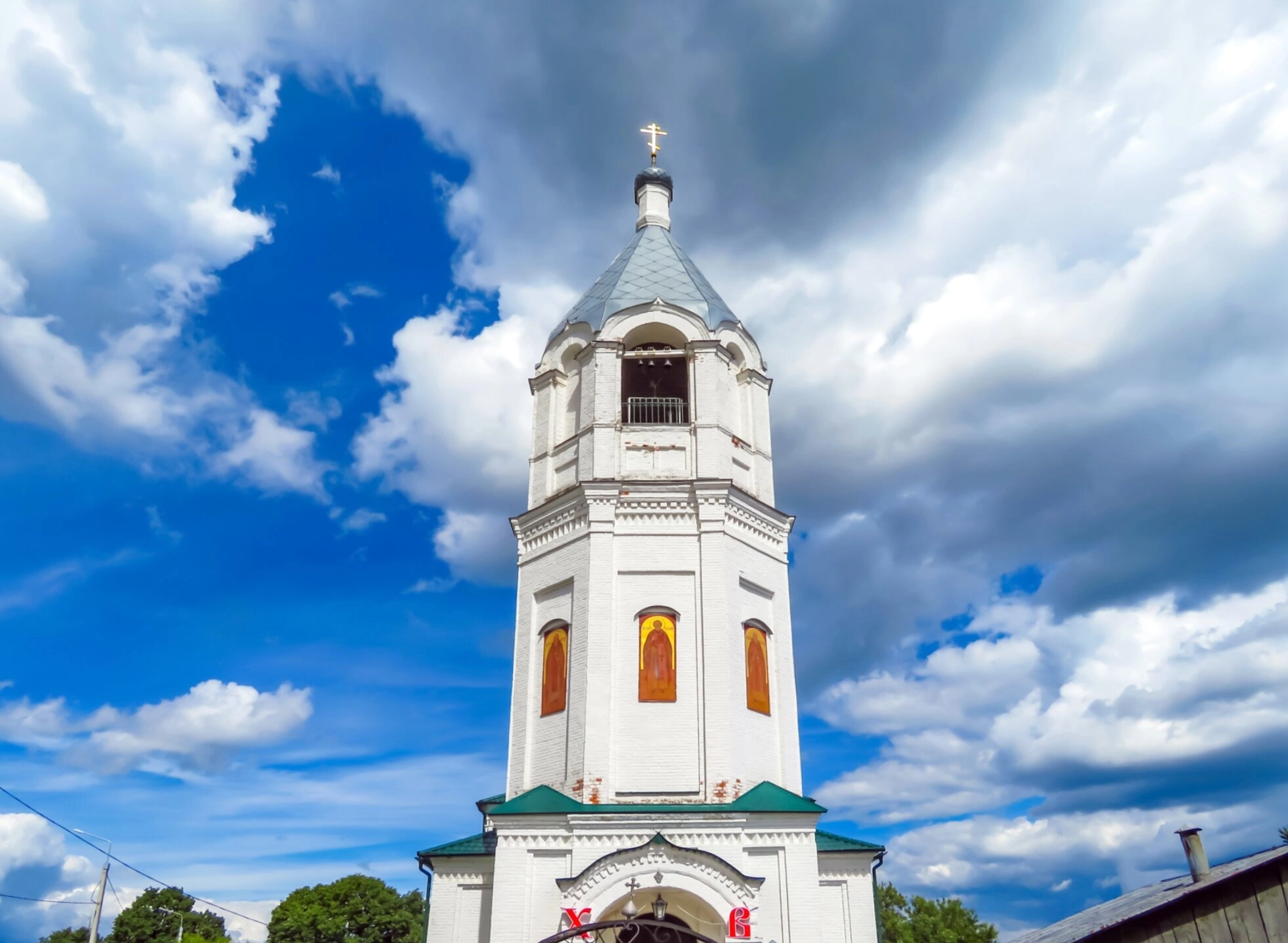 Храм в Тарутине имеет богатую историю, неразрывно связанную с событиями Отечественной войны 1812 года. Село известно благодаря знаменитому Тарутинскому сражению, а сама церковь является памятником культурного наследия и объектом историко-церковного значения. На фоне колокольни виден чистый голубой небосвод с легкими облаками, а по краям кадра — зелень деревьев, что подчёркивает умиротворённость и благолепие этого святого места.