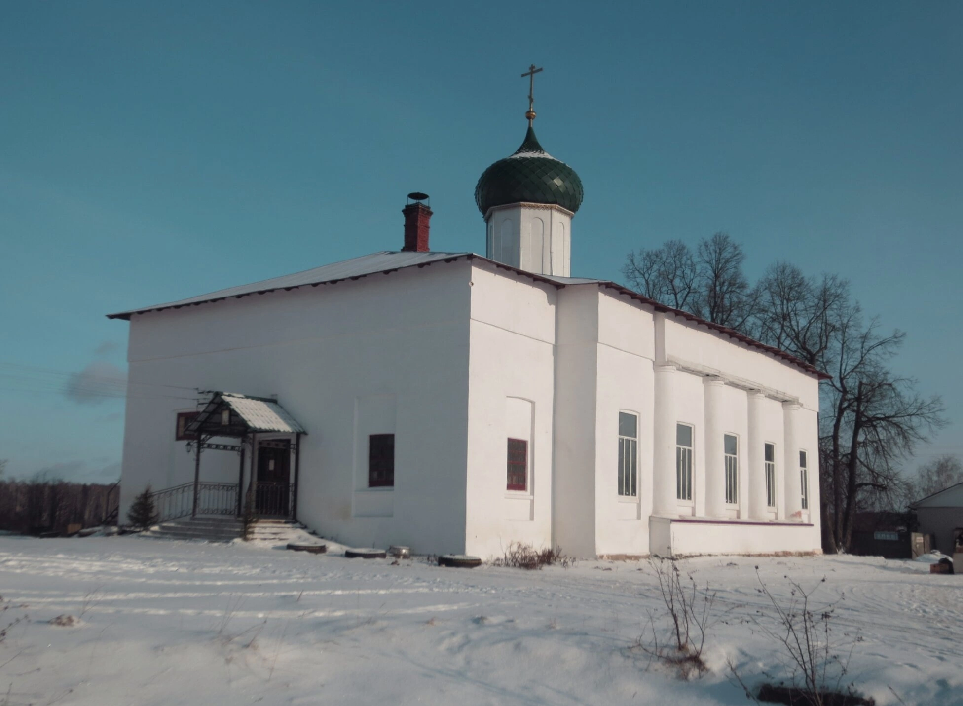 На представленной фотографии запечатлён зимний вид старинного православного храма — Церкви Святителя Николая Чудотворца, расположенной в селе Воскресенское Владимирской области. Белоснежный храм, увенчанный зелёной главкой с сияющим золотым крестом, величественно возвышается на фоне ясного голубого неба. Снежный покров окутывает землю и ветви окружающих деревьев, создавая атмосферу благоговейной тишины и чистоты, характерную для святок или зимних православных праздников.