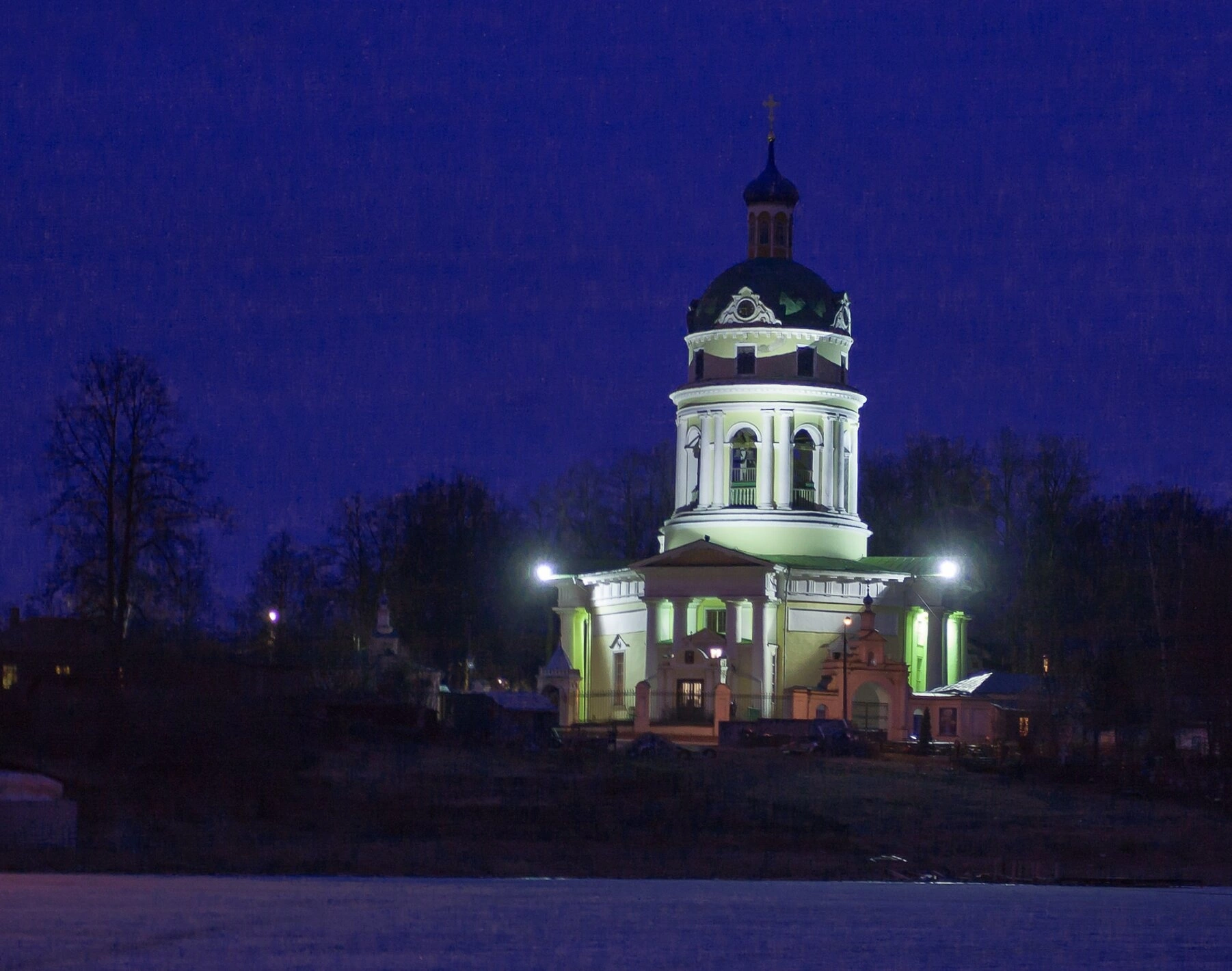 На представленной фотографии запечатлён величественный образ Церкви Святителя Николая Чудотворца, что располагается в исторической усадьбе Гребнево Московской области. Храм, освещённый в ночное время, предстаёт перед зрителем в ореоле благодатного света, символизируя нетварный свет веры и надежды.
