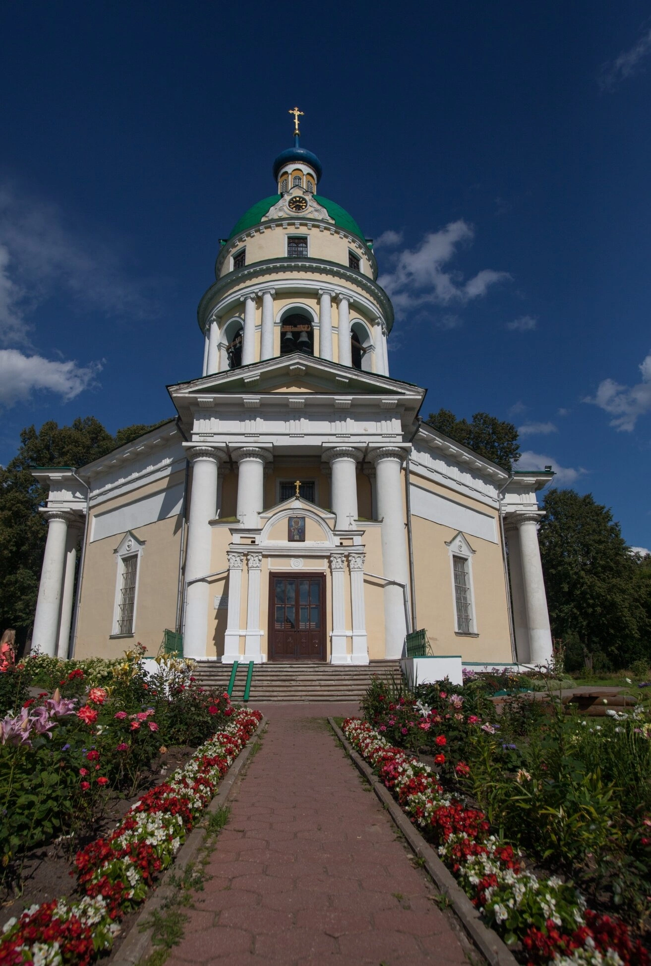 Фотография сделана в погожий летний день, когда лазурное небо с белоснежными облаками создаёт идеальный фон для светло-жёлтых стен храма. К центральному входу ведёт аккуратная вымощенная дорожка, обрамлённая ухоженными клумбами с цветущими розами и бальзаминами. Пышная зелень вековых деревьев, окружающих храм, подчёркивает его величие и гармонично вписывает в природный ландшафт.