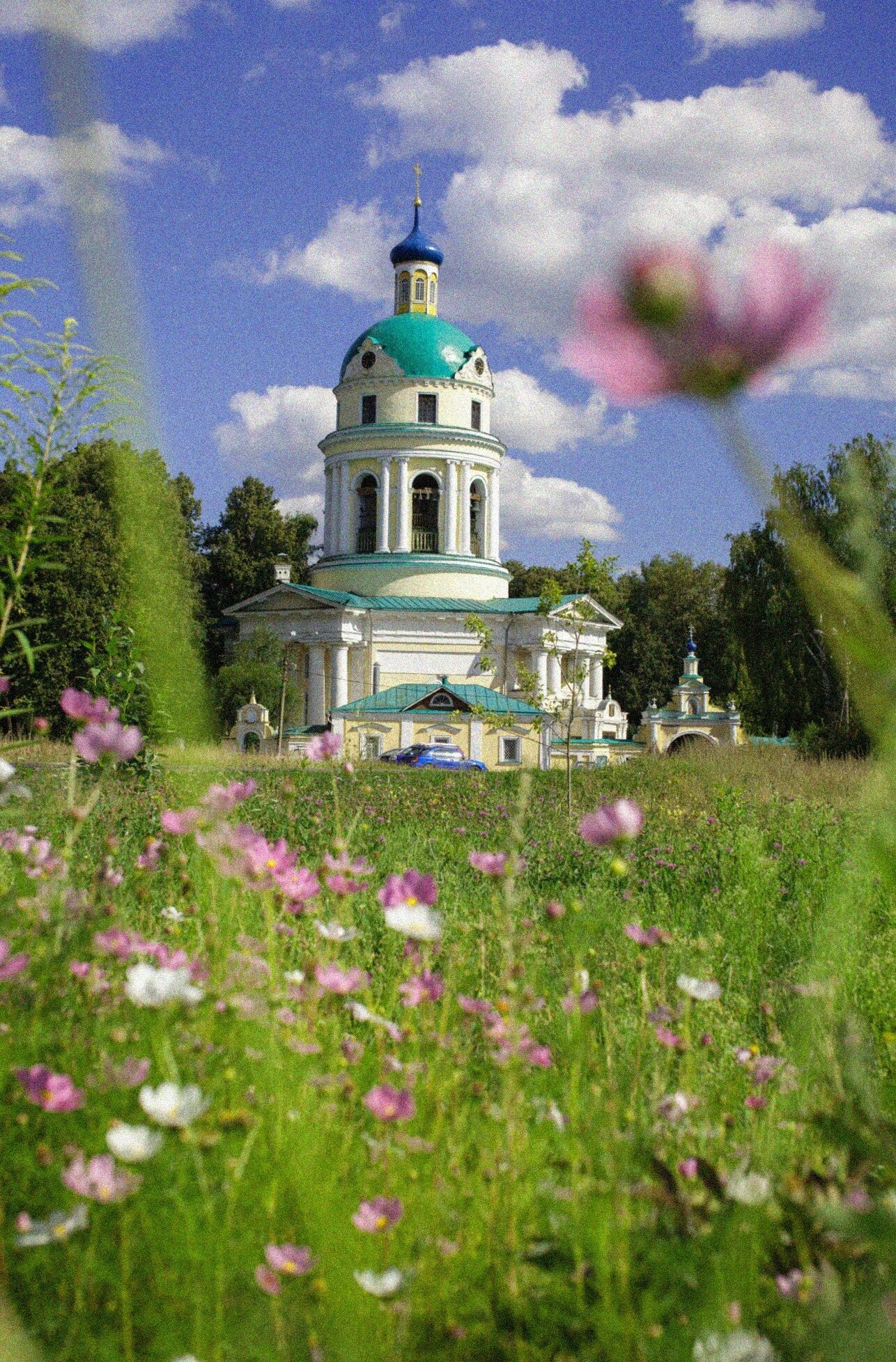 Фотография передаёт умиротворённый вид на храм, окружённый зеленью деревьев и полевыми цветами, среди которых виднеется космея. Этот образ символизирует надежду на возрождение былого величия и продолжение молитвенной жизни в стенах древней святыни, посвящённой одному из самых почитаемых на Руси святых — Николаю Угоднику.