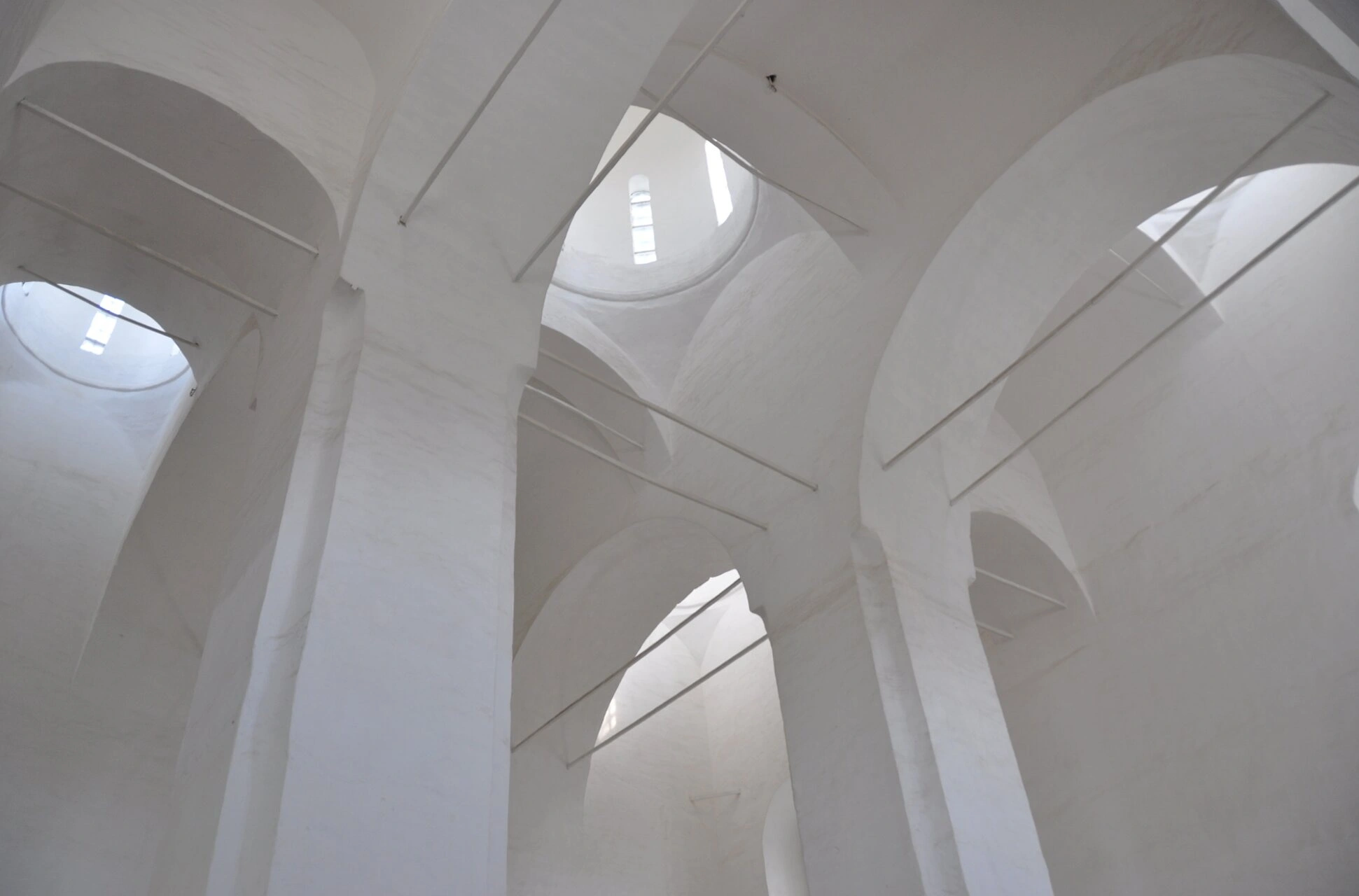 На фотографии запечатлён уникальный интерьер храма Святителя Николая Чудотворца, что во Владычной слободе города Вологды. Снимок позволяет рассмотреть монументальную двухстолпную конструкцию святыни, возведённой в 1669 году. Мощные столпы, поддерживающие высокие своды, создают ощущение величия и незыблемости православной веры.