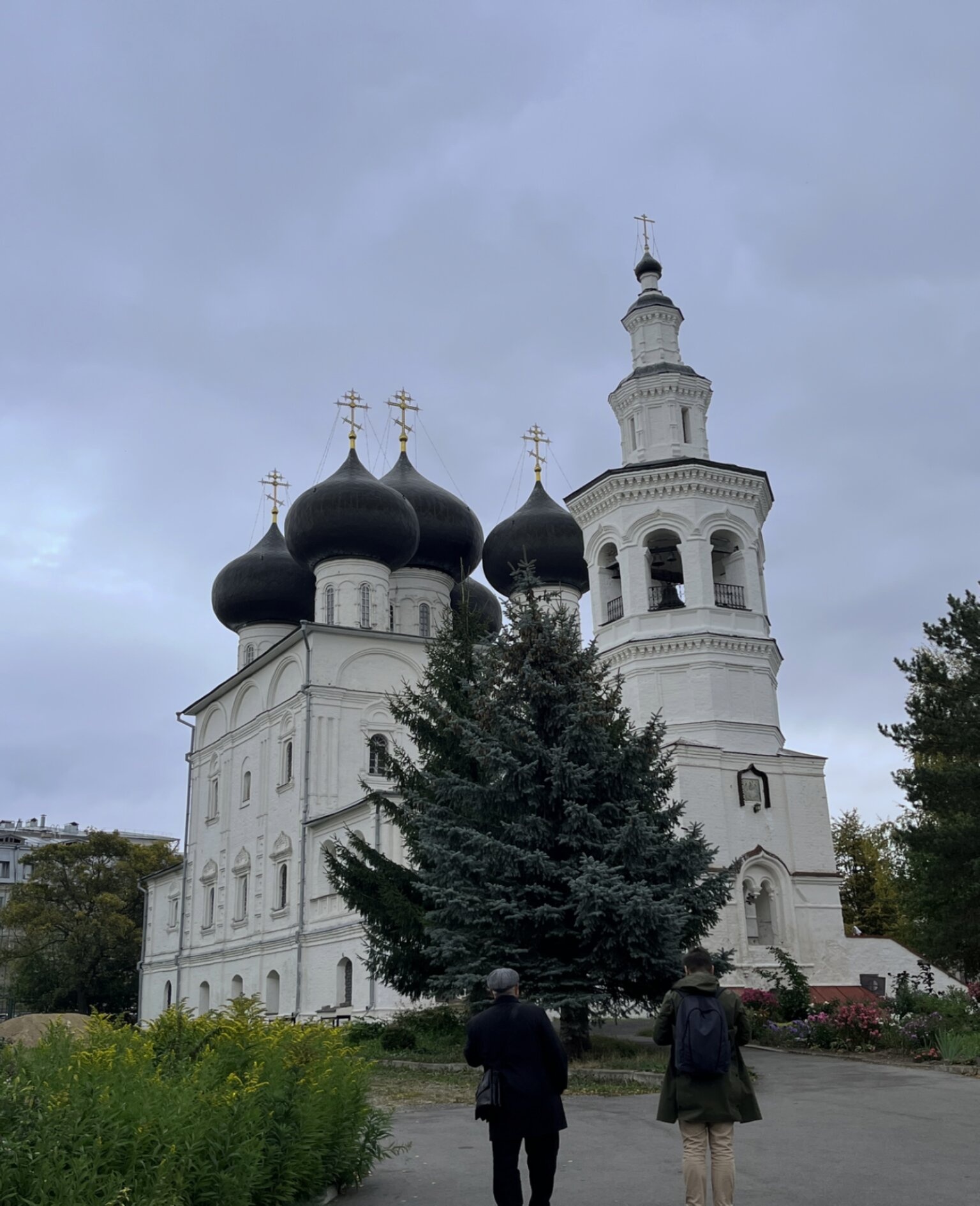 Обитель окружена ухоженной территорией с тенистыми деревьями и кустарниками, где прихожане и паломники находят покой и умиротворение. На переднем плане фотографии видны благочестивые христиане, совершающие неспешную прогулку по церковному двору, что добавляет снимку особой жизненной теплоты и свидетельствует о действенности храма как дома молитвы.