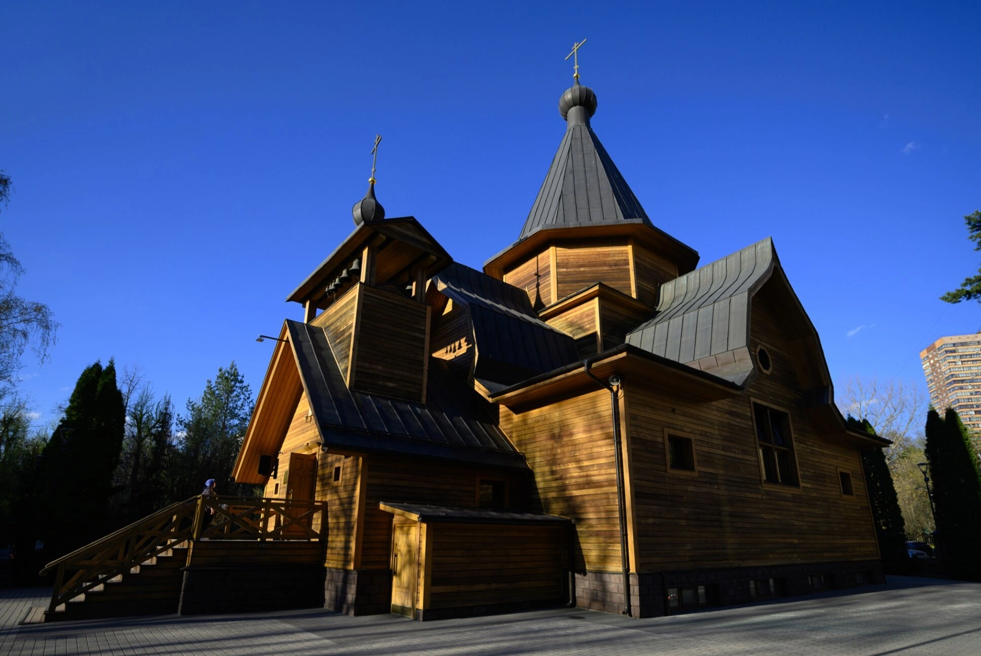 Церковь окружена зеленью деревьев и кустарников, что подчёркивает её гармонию с природой. Слева к входу ведёт деревянная лестница, а на заднем плане справа виднеется многоэтажное жилое здание, напоминающее о городском контексте.