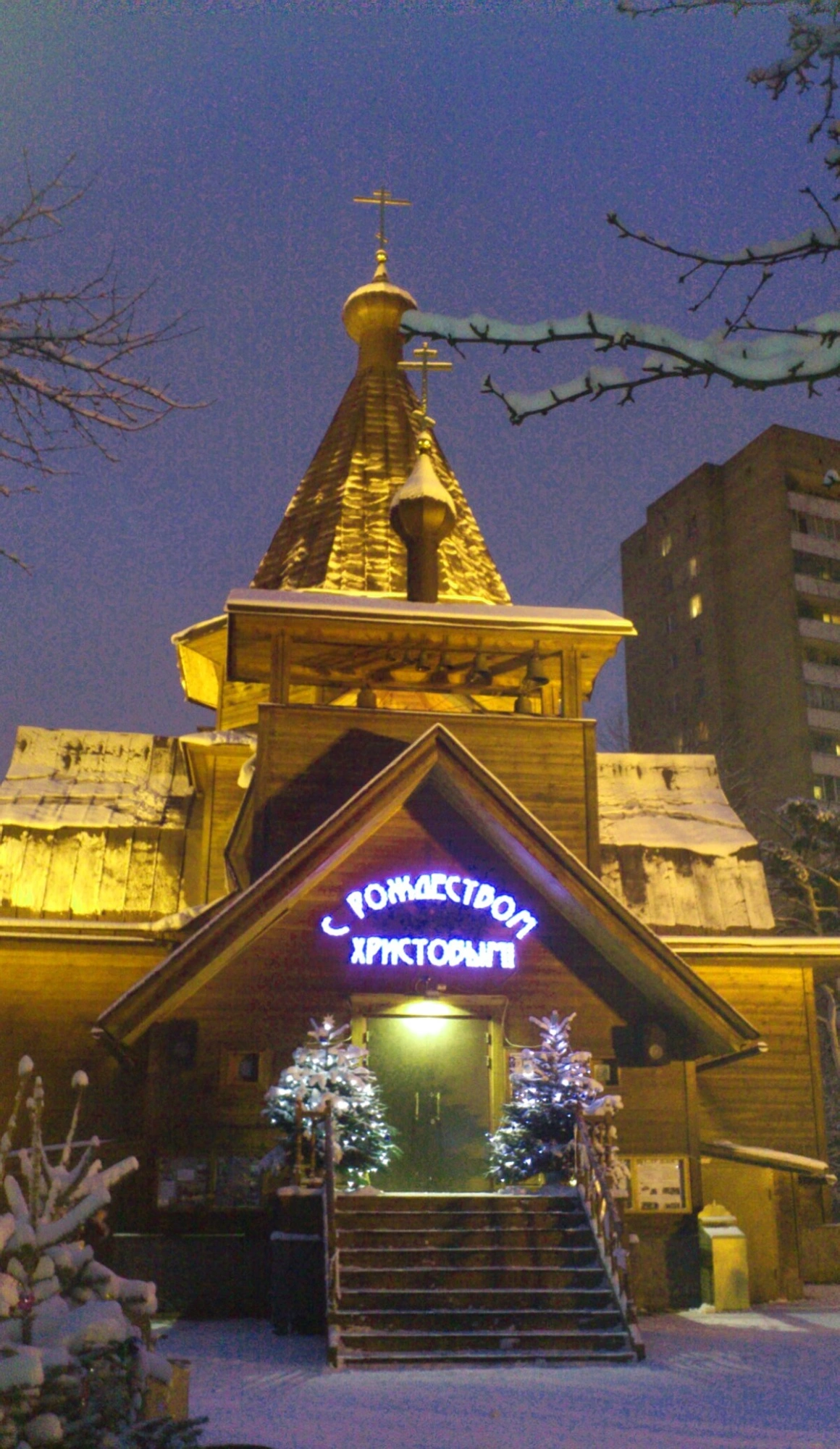 На фотографии запечатлён храм во имя святителя Николая Чудотворца, что у Соломенной Сторожки, в величественном зимнем убранстве. Снег окутывает деревянные стены церкви, создавая образ благоговейной тишины и чистоты, характерный для святок. Яркая неоновая надпись «С РОЖДЕСТВОМ ХРИСТОВЫМ» на фасаде свидетельствует о праздновании одного из главных христианских торжеств и призывает верующих разделить радость о рождении Спасителя.