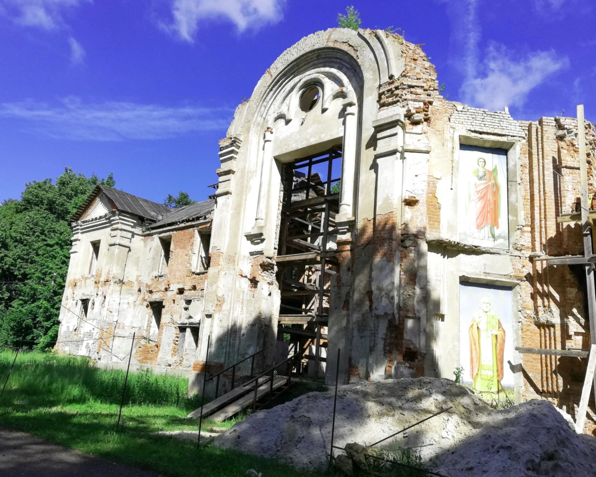Перед фасадом храма виднеется искусственная насыпь, возможно, связанная с попытками консервации памятника или археологическими изысканиями. Окружающий пейзаж с молодой растительностью и высоким небом создаёт атмосферу тихой молитвы и надежды на возрождение. Исторические источники свидетельствуют, что этот храм был важным духовным центром для жителей окрестных поселений, а ныне его руины служат напоминанием о трагических страницах истории русского православия.