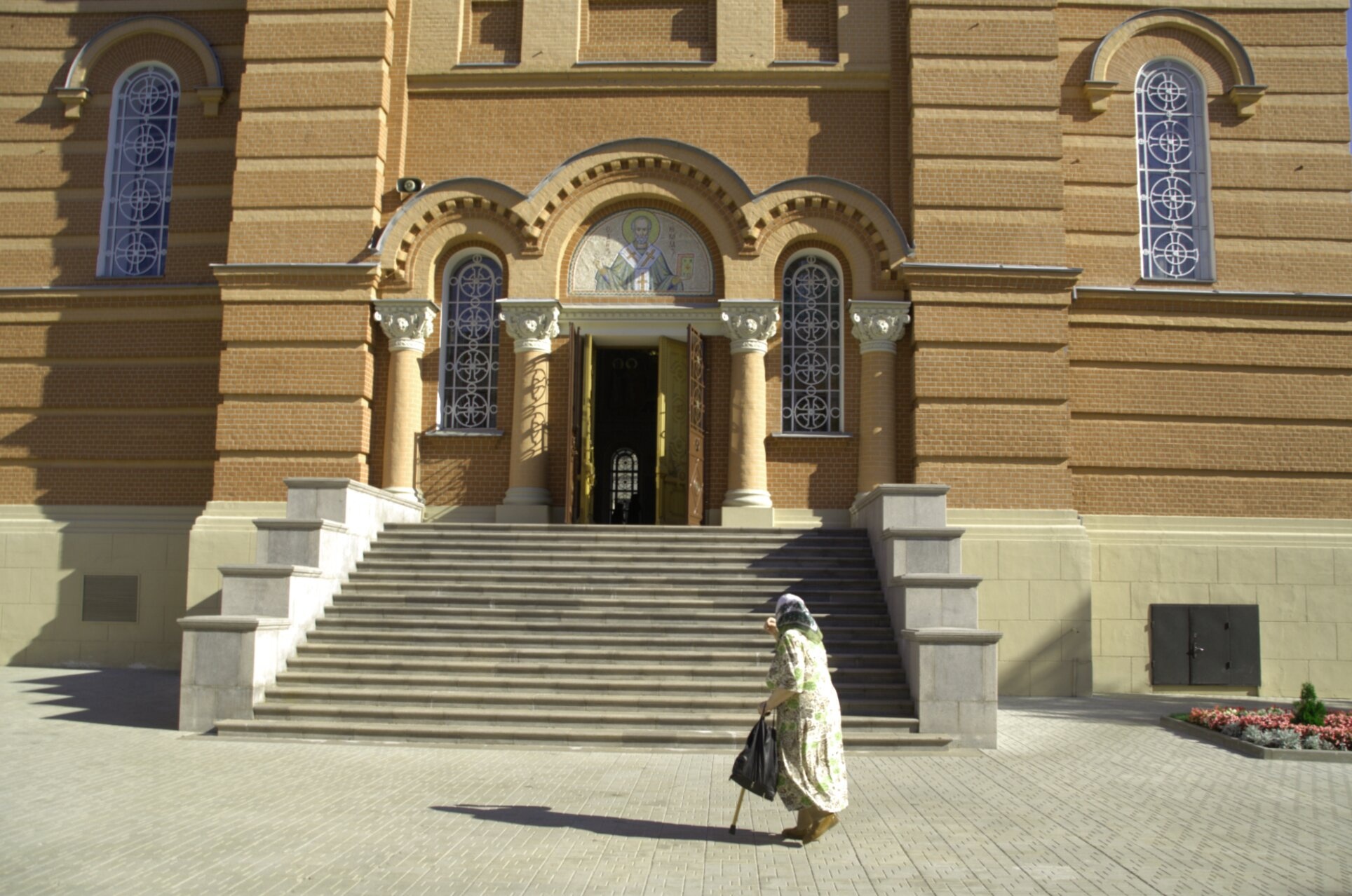 Перед храмом простирается мощеная площадь, по которой движется благочестивая прихожанка в традиционном платке и длинной одежде, опирающаяся на трость. Этот образ подчеркивает намоленность места и его значение для верующих. Справа от здания виднеется ухоженный участок с цветочными насаждениями, что добавляет картине уюта и гармонии.