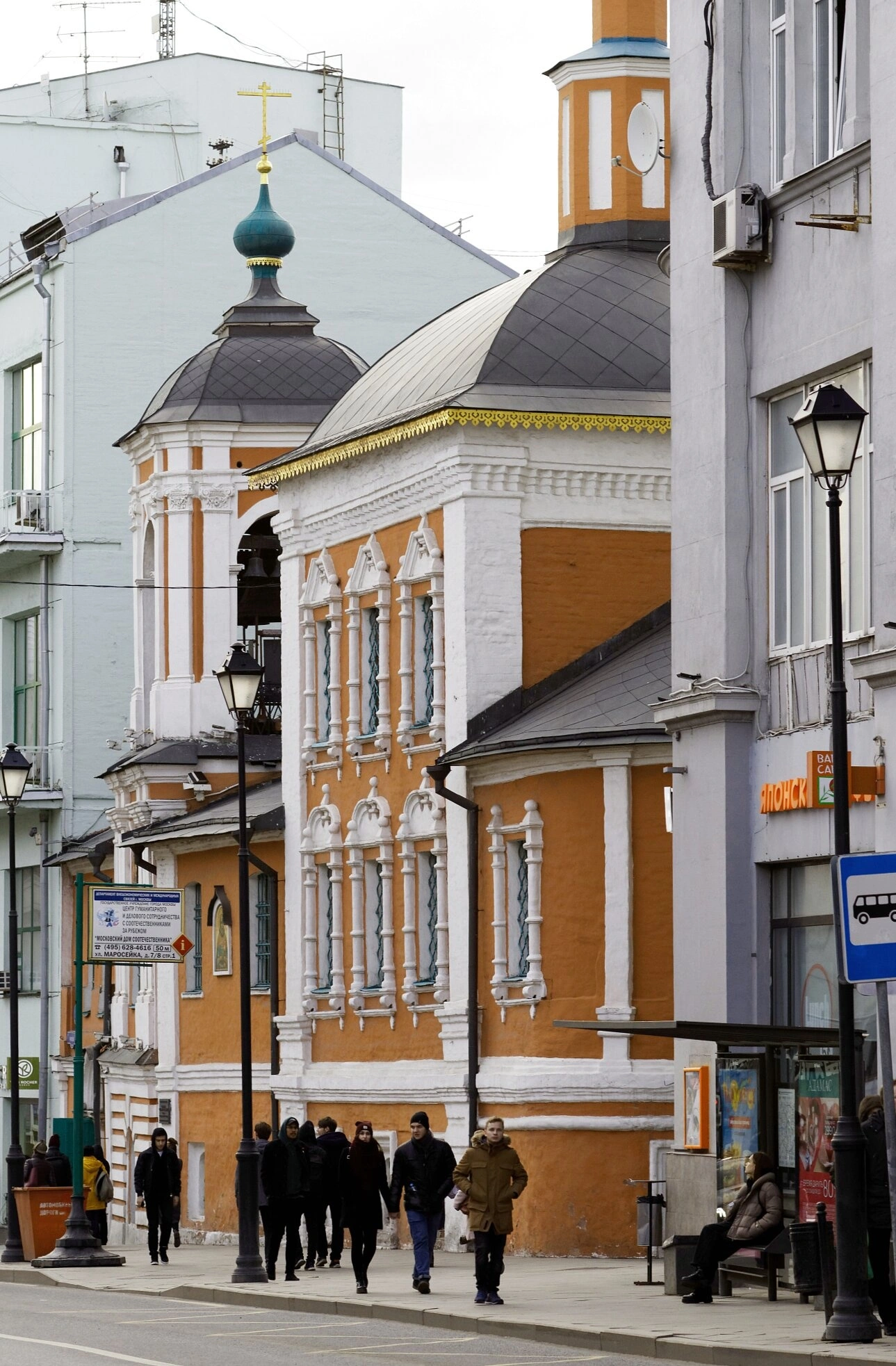 Благодаря удачному ракурсу съёмки на фотографии хорошо просматриваются архитектурные детали храма: ажурные кресты, фигурные наличники окон и традиционное для древнерусского зодчества трёхчастное деление фасада. Снимок передаёт уютную атмосферу старомосковского переулка, где древняя святына органично вписана в городской ландшафт.