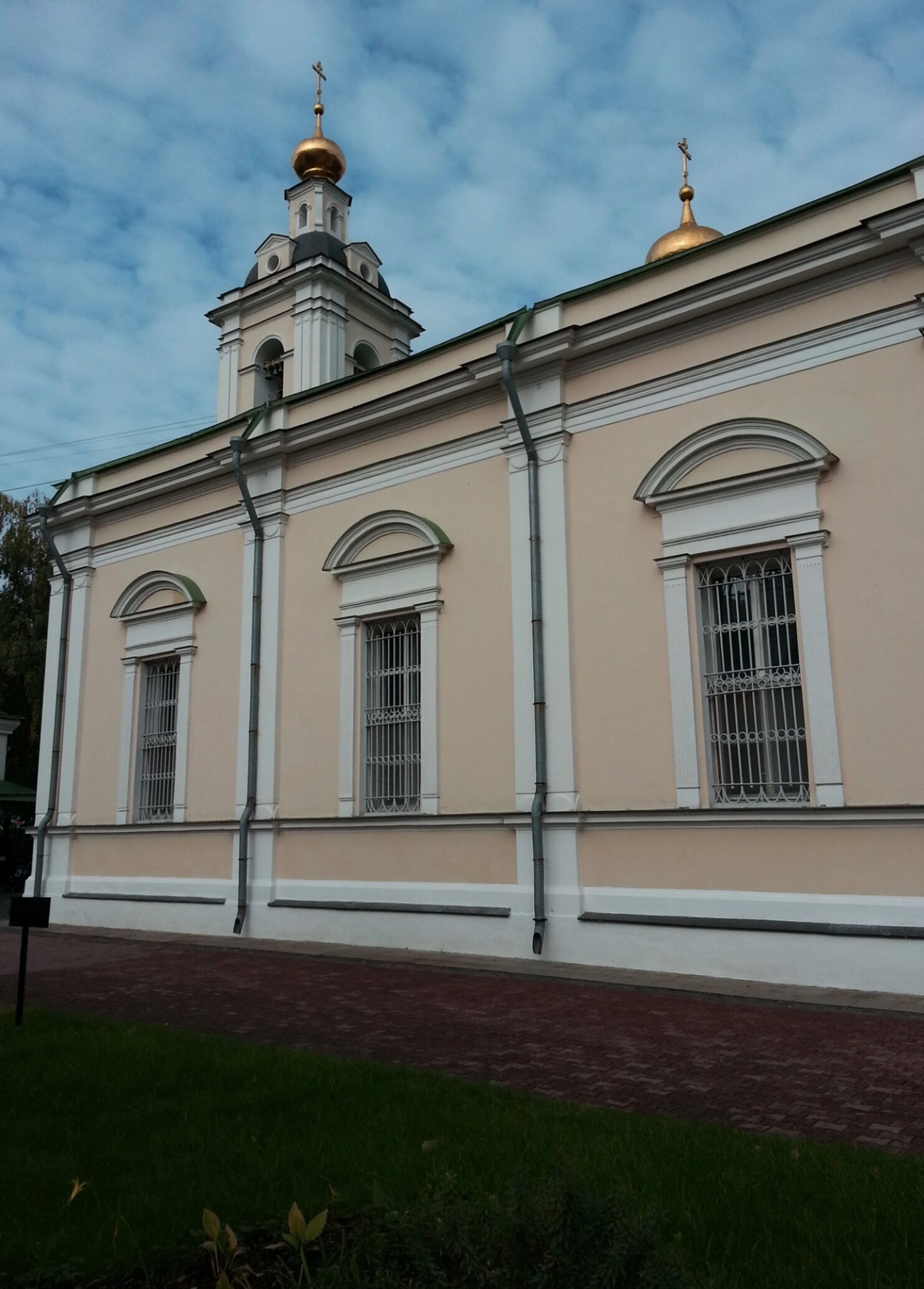 На переднем плане фотографии видны ухоженные газоны и мощеная дорожка, ведущая к входу в храм. Спокойное светлое небо с облаками создает гармоничный фон для архитектурного ансамбля, подчеркивая его духовное значение и историческую ценность. В настоящее время храм является действующим и принадлежит Московской епархии Русской Православной Церкви.