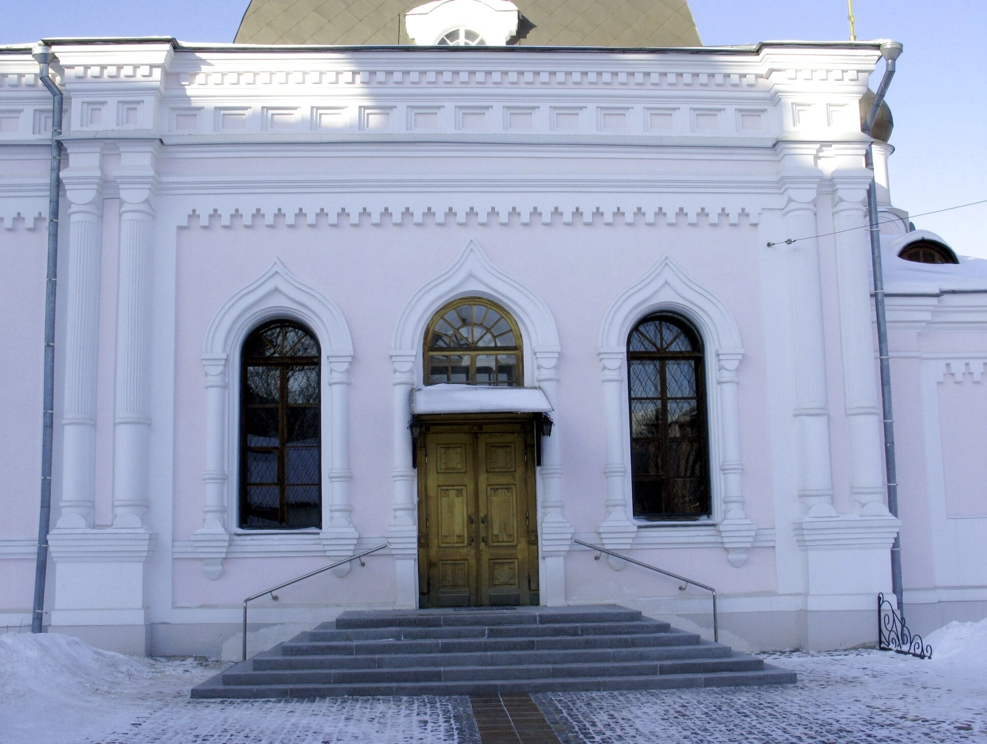 К центральному входу ведёт каменная лестница с несколькими ступенями, оборудованная металлическими перилами для удобства прихожан. В зимнее время ступени покрыты снежным покровом, что создаёт особое настроение благоговейной тишины и умиротворения, свойственное храмовому пространству в холодное время года.