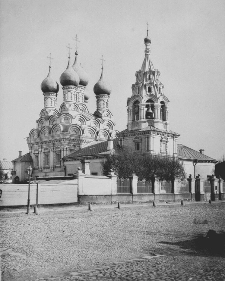 На фотографии запечатлён храм в его первозданной красоте, с сохранившимися деталями убранства и окружающей застройкой. Снимок позволяет оценить масштаб и пропорции святыни, а также её значение в градостроительной композиции одной из старейших улиц Москвы.