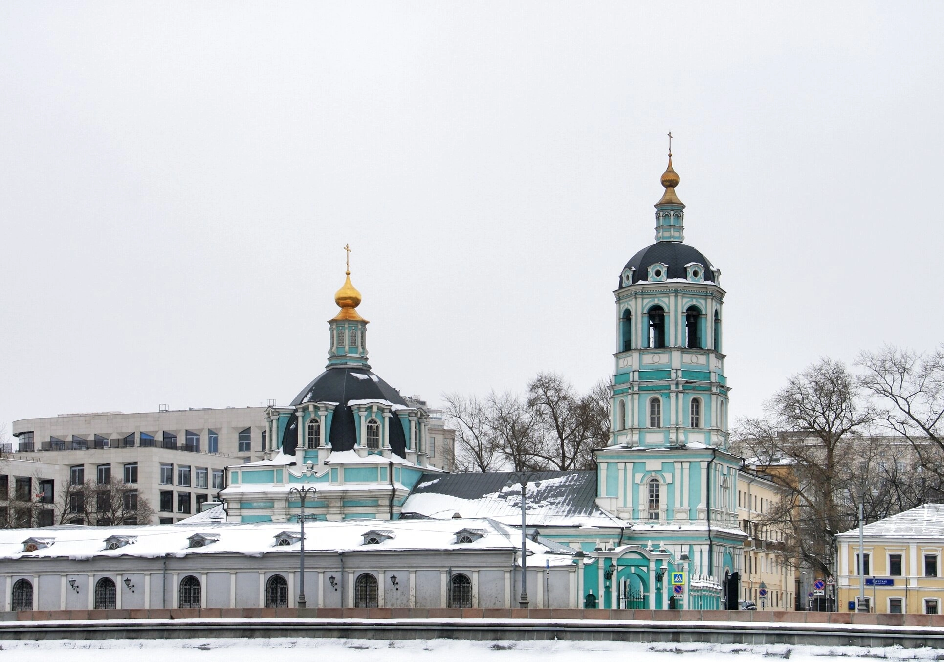 На представленной фотографии запечатлен храм Святителя Николая Чудотворца в Заяицком, расположенный во 2-м Раушском переулке Москвы. Святыня возвышается на берегу Водоотводного канала, создавая величественный архитектурный ансамбль в самом сердце столицы.