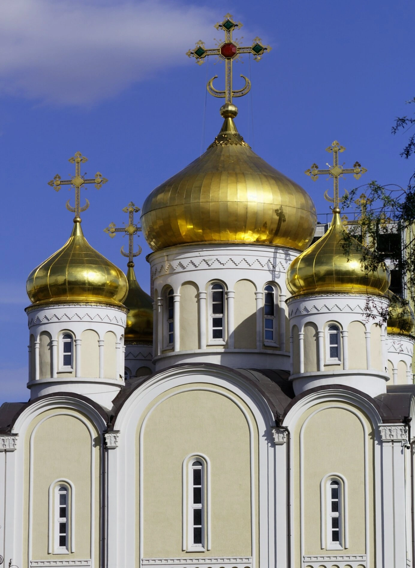 Белоснежные стены церкви устремляются ввысь, увенчанные златыми куполами, сияющими под небосводом. На главном из них, символизирующем Господа Иисуса Христа, установлен благодатный крест. Ярусная колокольня гармонично завершает архитектурный ансамбль, придавая ему законченный и стройный вид.