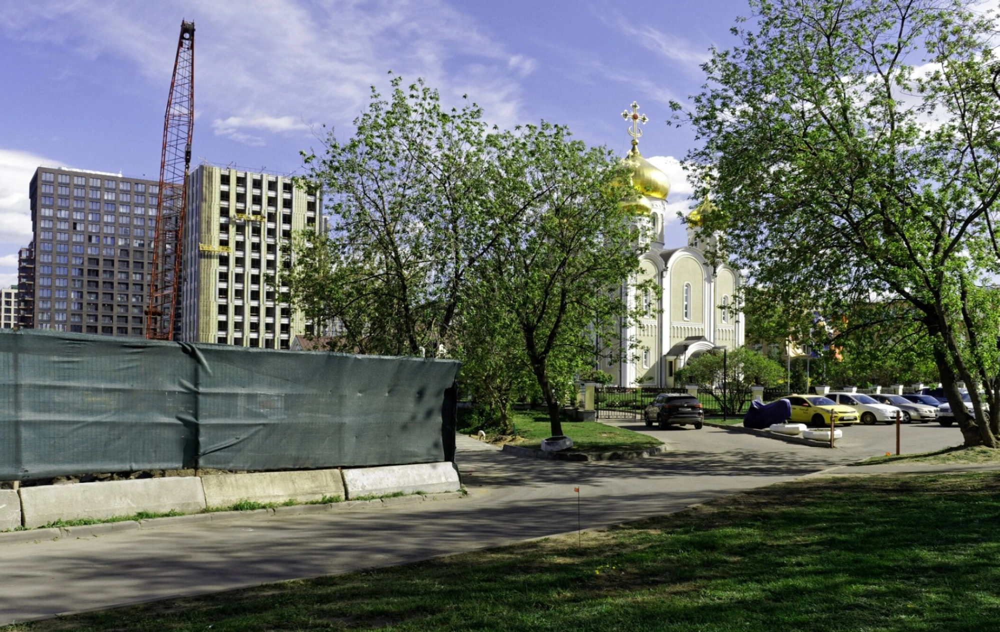 На заднем плане заметны строительные краны и возводимые жилые дома, что свидетельствует о динамичном развитии района. Такое соседство подчёркивает важную роль храма как духовного центра в формирующейся городской среде. Присутствие автомобилей на парковке указывает на активную приходскую жизнь.
