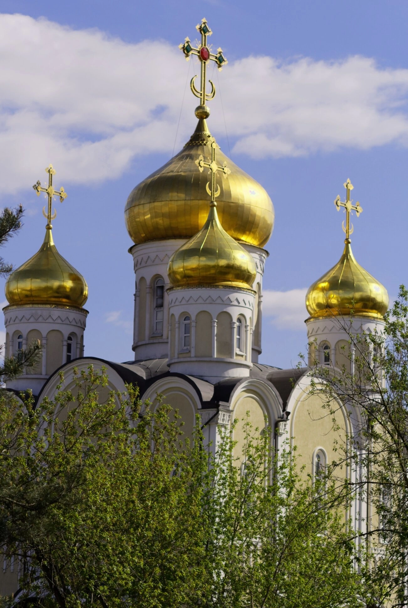 На фотографии запечатлён величественный храм во имя святителя Спиридона Тримифунтского, расположенный в районе Нагатинский Затон города Москвы. Святыня возведена в лучших традициях русского церковного зодчества, о чём свидетельствуют устремлённые ввысь золочёные купола-луковки, увенчаные православными крестами.