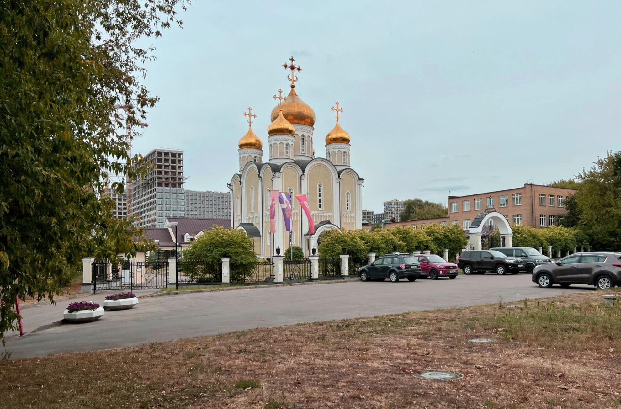 Фотография передаёт не только внешнюю красоту церковного строения, но и его органичное вписывание в городской ландшафт. На заднем плане видны современные жилые здания, что символизирует неразрывную связь вековых православных традиций с современной жизнью мегаполиса. Этот храм служит духовной опорой и местом молитвенного утешения для многих жителей столицы.