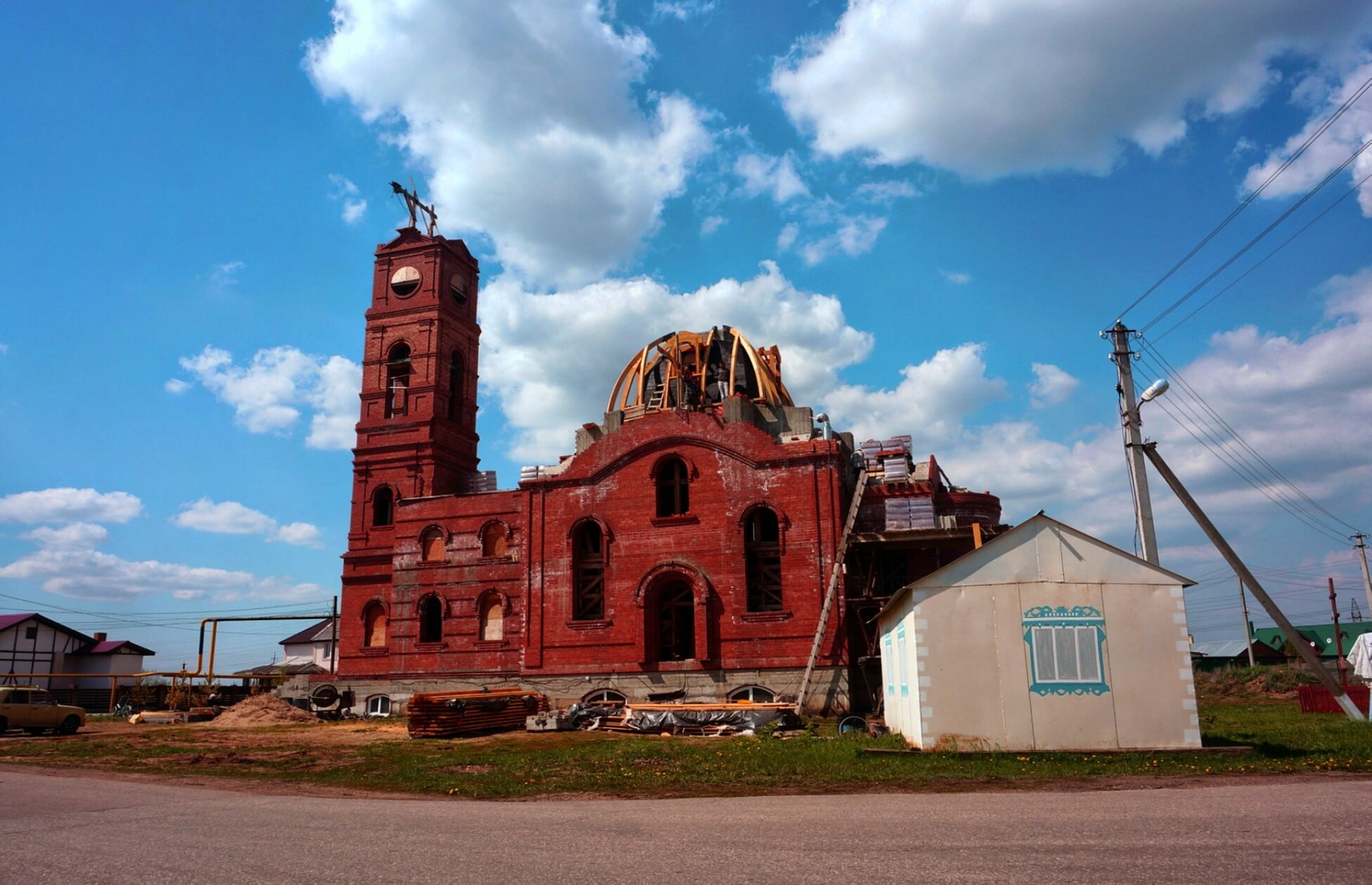 Архитектурный облик храма соответствует традициям русского церковного зодчества. Основной объем выполнен из красного кирпича, что создает благородный и строгий внешний вид. На фотографии хорошо видна высокая колокольня, увенчанная часовым механизмом, что является редкой и ценной деталью для сельского храма. Венчающий храм купол находится на этапе завершения строительных работ, что свидетельствует о продолжающемся благоустройстве церковной территории.