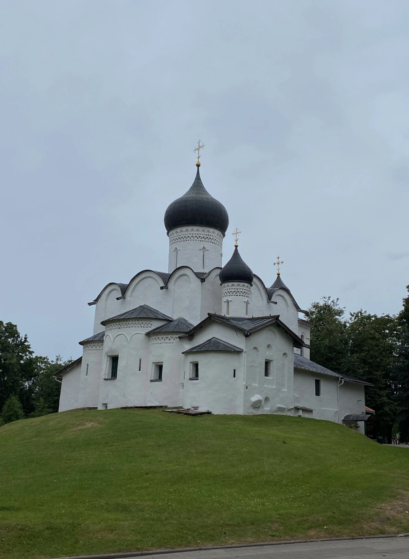 На представленной фотографии запечатлён древний православный храм Пскова — церковь Святителя Василия Великого на Горке. Этот белокаменный памятник древнерусского зодчества является одним из символов духовной стойкости и архитектурного мастерства Святой Руси.