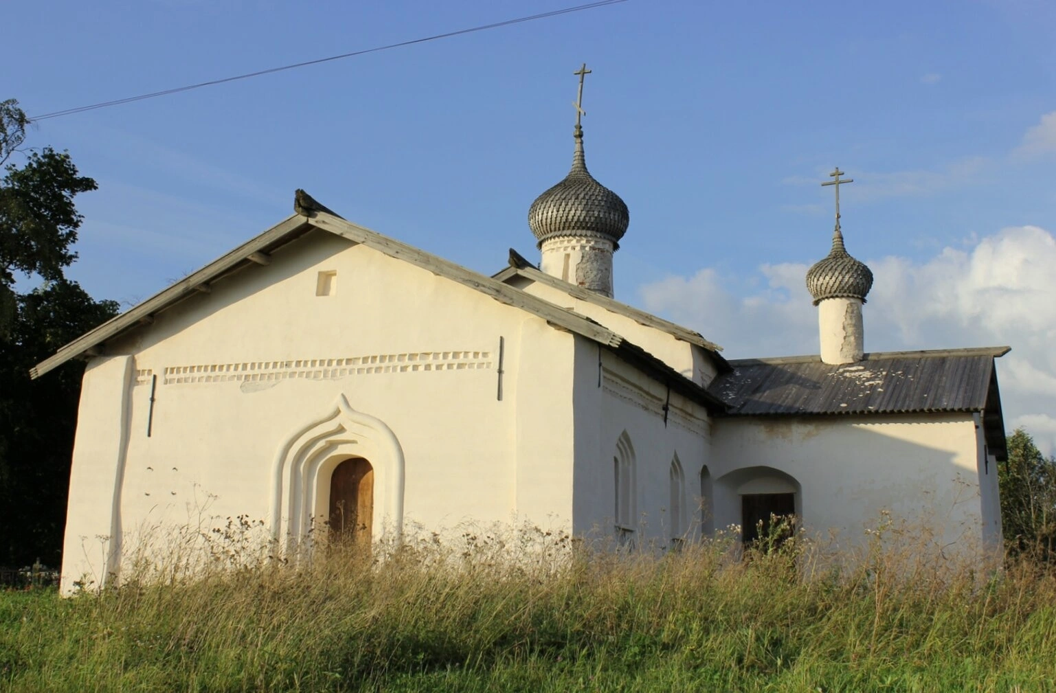 Белоснежный каменный храм, построенный в XVII веке, представляет собой великолепный образец древнерусского церковного зодчества. На снимке чётко виден его строгий и благолепный облик: одноапсидный объём, увенчанный двумя главами, которые символизируют два естества Господа нашего Иисуса Христа – Божественное и человеческое. На каждой из глав установлен золочёный восьмиконечный православный крест, сияющий под лучами солнца.