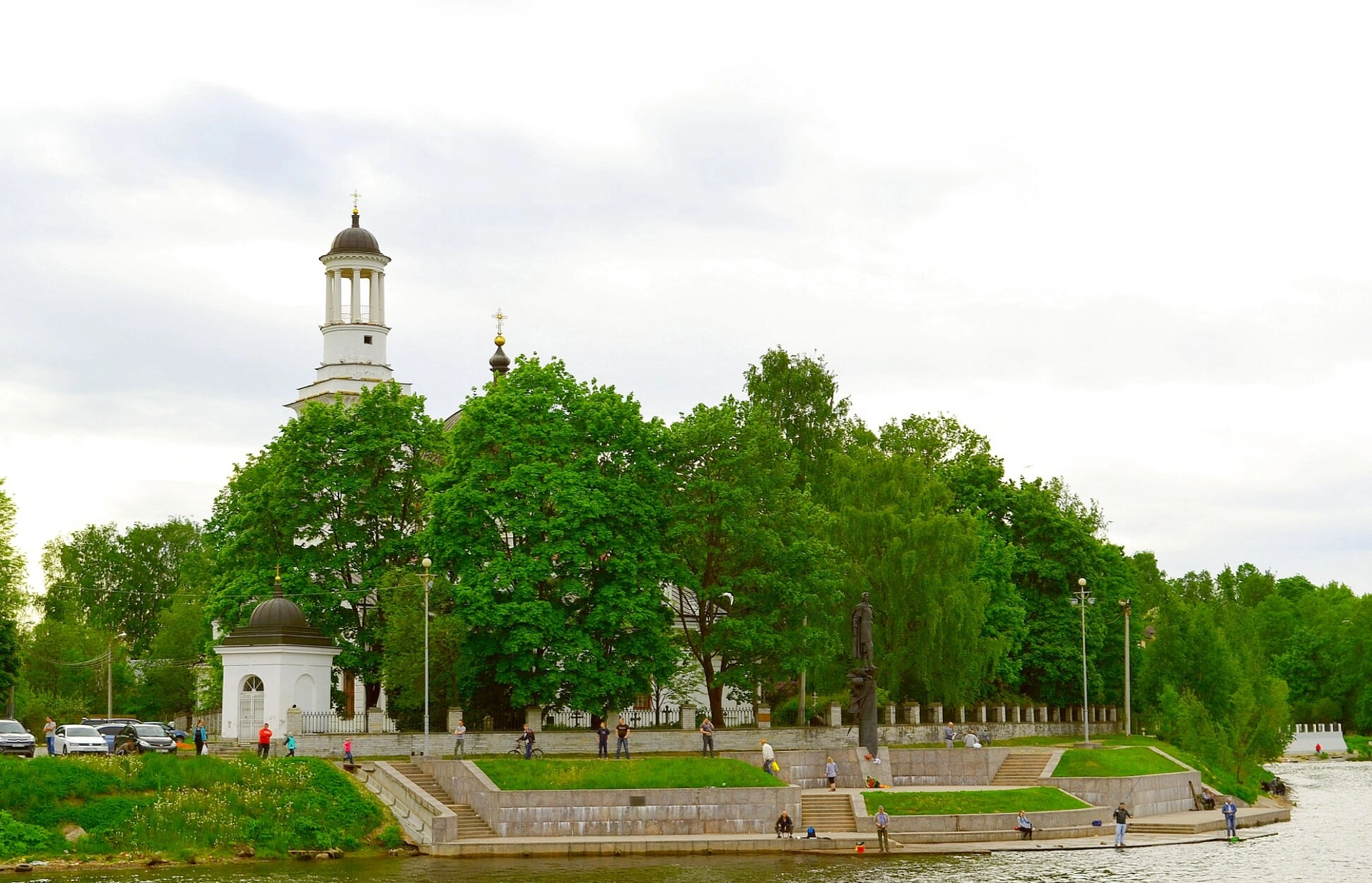 На набережной и вдоль реки видны прихожане и местные жители, некоторые из которых, по сложившейся традиции, занимаются рыбной ловлей. Это место обладает особой атмосферой спокойствия и благодати, сочетая в себе мемориальную значимость и живую приходскую жизнь. Небо затянуто лёгкими облаками, что придаёт пейзажу сдержанный и лиричный характер, напоминая о северной, смиренной красоте русской земли, осенённой молитвой и историей.