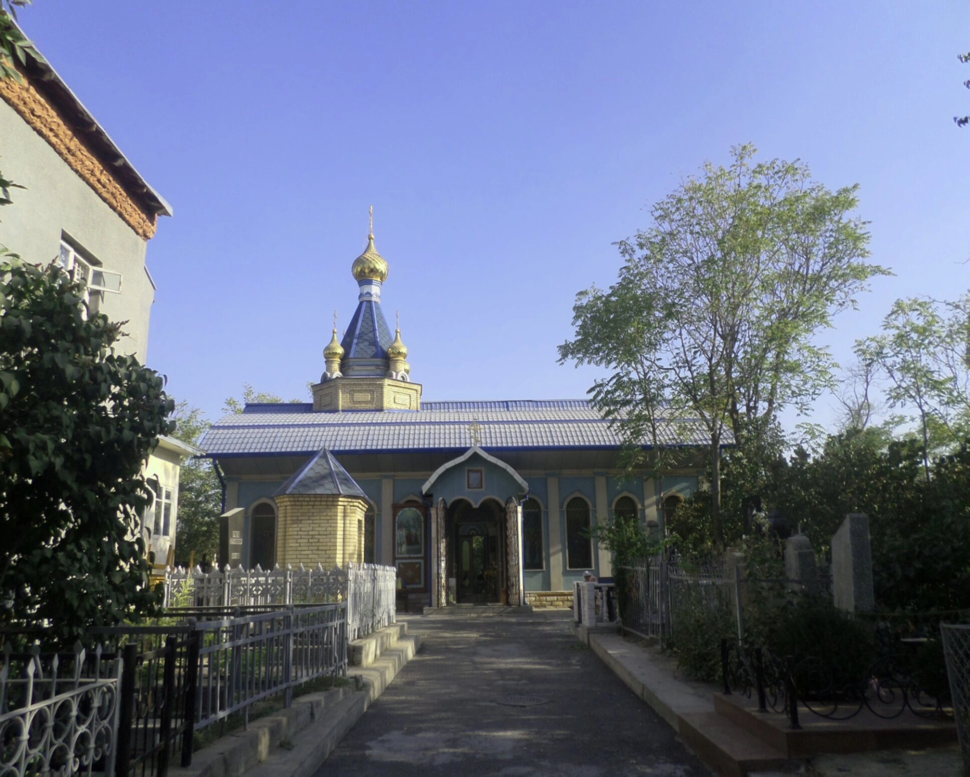 На представленной фотографии запечатлён храм во имя святого благоверного князя Александра Невского, расположенный на территории Боткинского кладбища в Ташкенте. Этот православный храм является значимым духовным центром для верующих города и важным памятником русской церковной архитектуры в Узбекистане.