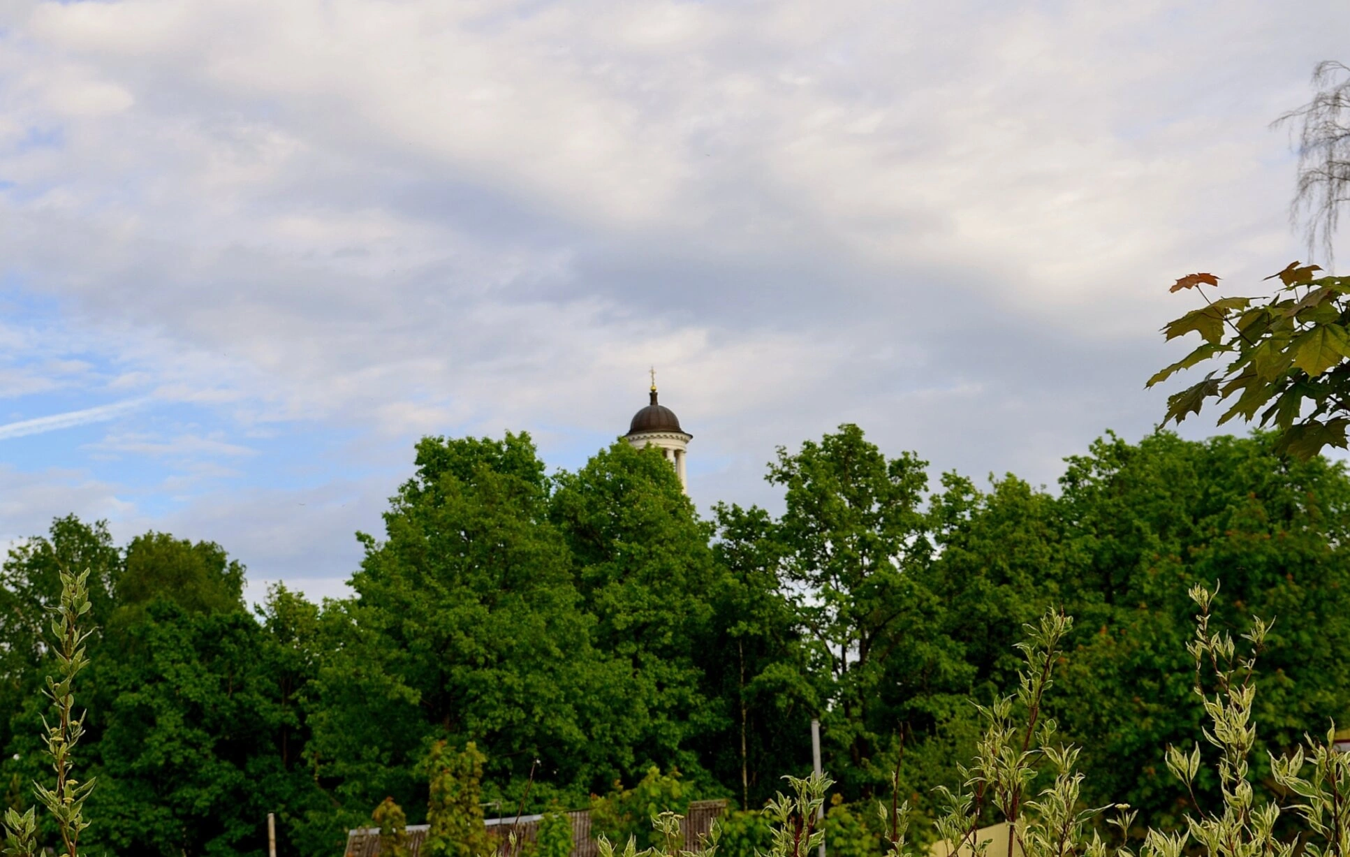 На фотографии запечатлён живописный вид на православный храм во имя святого благоверного великого князя Александра Невского, расположенный в историческом месте — посёлке Усть-Ижора. На переднем плане изображения видны густые кроны деревьев и кустарников, обрамляющие святыню и создающие ощущение уединённости и покоя. Над зеленью возвышается величественный купол церкви, увенчанный православным крестом, и шатровая колокольня, которые являются архитектурными доминантами данной местности.