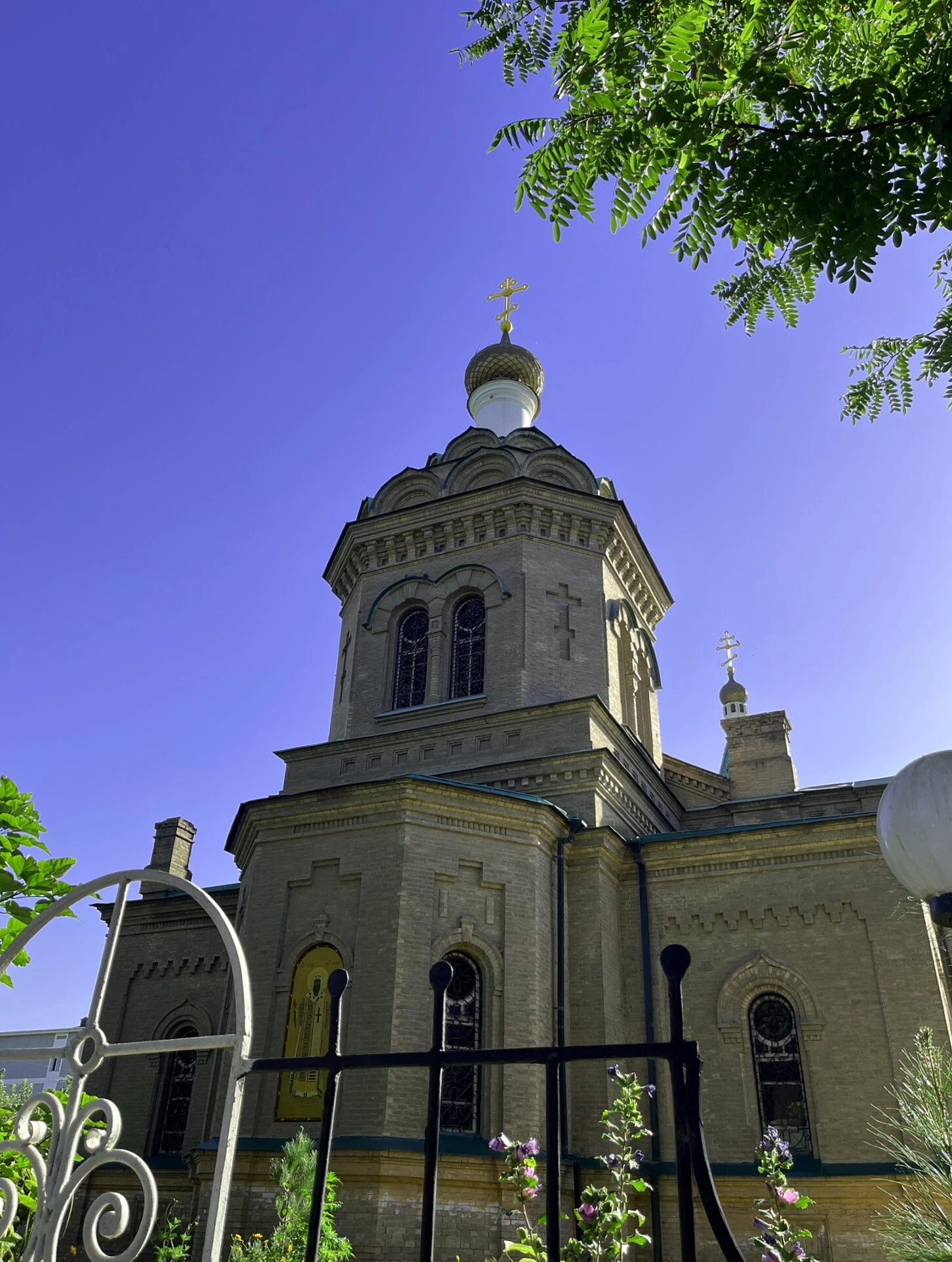 По сторонам от здания видны кроны деревьев с сочной зеленью, а также фрагменты церковной ограды, что указывает на благоустроенность и ухоженность территории святого места. Храм Святого Алексия является одним из духовных центров православия в Узбекистане и представляет собой не только место молитвы, но и памятник истории и культуры, свидетельствующий о присутствии русской традиции в сердце Средней Азии.