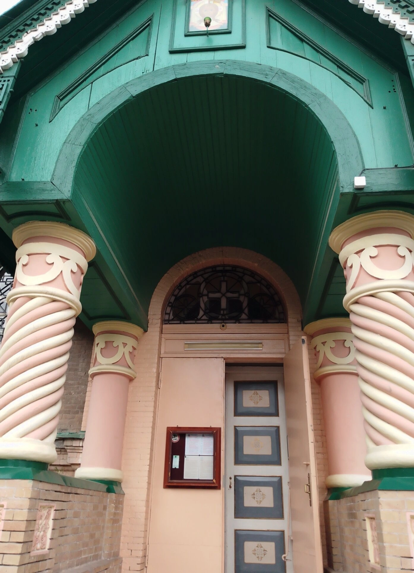 Над арочным проёмом возвышается небольшой барабан, несущий скромный купол, в котором прорублено окно, обеспечивающее естественное освещение внутреннего пространства притвора. Двустворчатая входная дверь, изготовленная из добротного дерева, богато украшена резными декоративными панелями, что придаёт ей торжественный вид. Непосредственно над дверью расположено арочное витражное окно, через которое в храм проникает мягкий цветной свет, создающий особую молитвенную атмосферу.