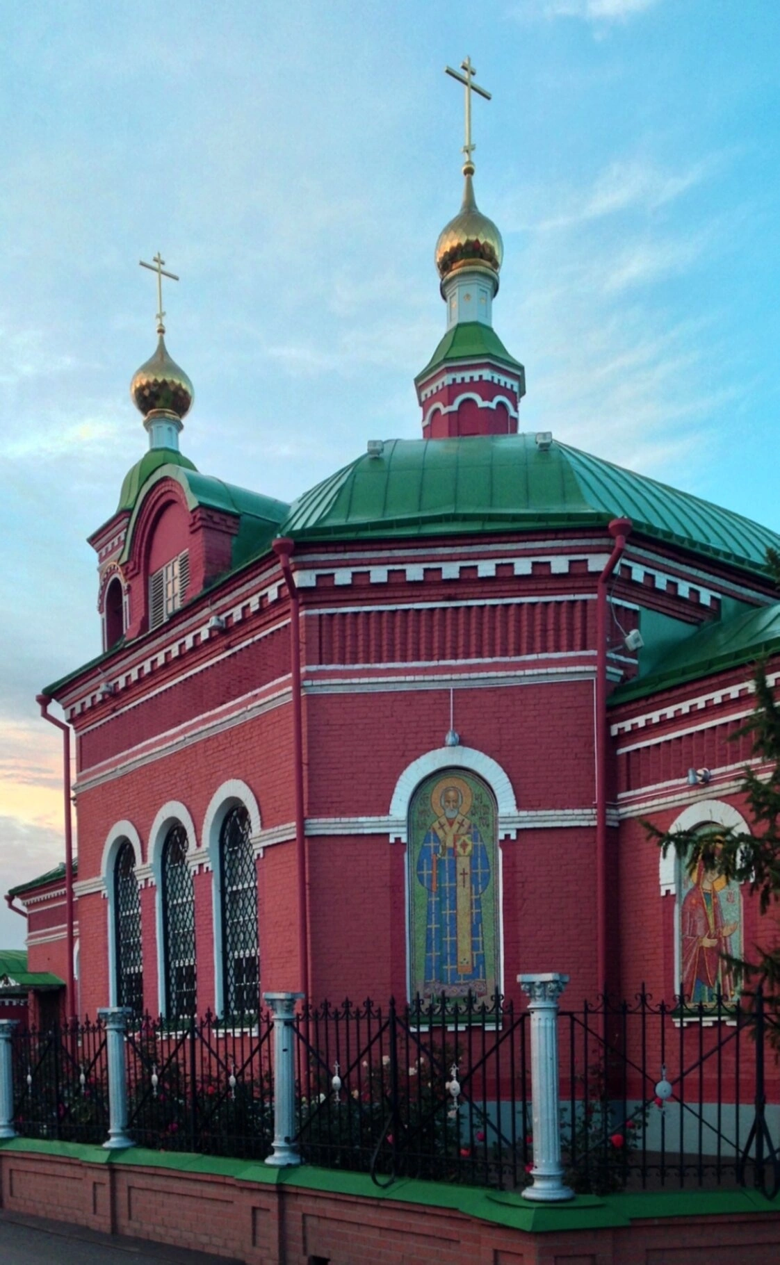 На представленной фотографии запечатлён величественный православный храм во имя святого апостола и евангелиста Иоанна Богослова, расположенный в городе Оренбурге. Святыня, возведённая из красного кирпича, устремлена в небесную высь золочёными крестами, венчающими зелёные купола.
