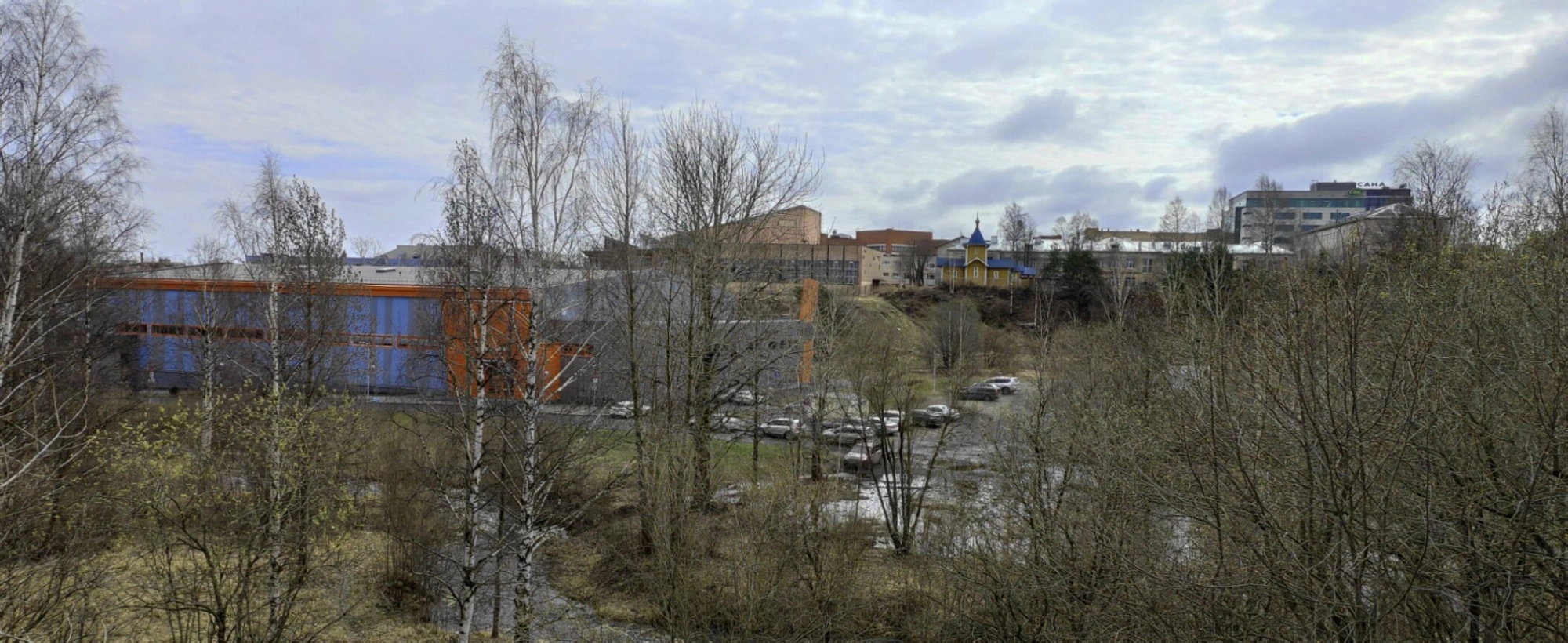 Слева от храма располагается современное городское здание, однако оно не доминирует над святым местом, а лишь подчёркивает его благодатную отстранённость от суеты мирской. На заднем плане простираются жилые кварталы города Петрозаводска, столицы Республики Карелия.