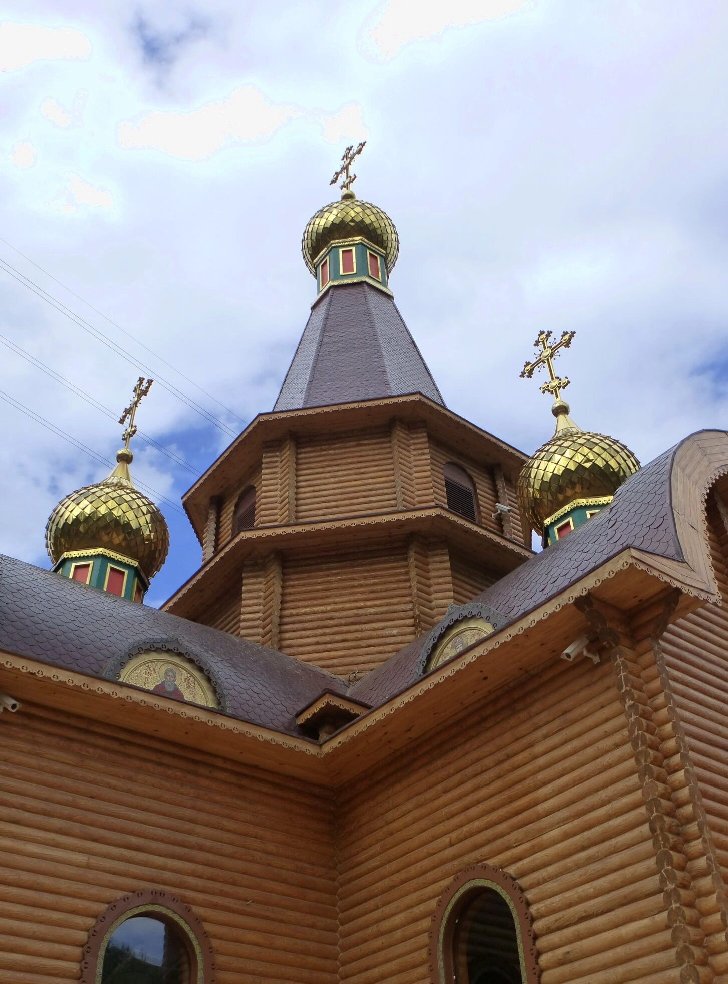 Храм представляет собой образец традиционного русского церковного зодчества, выполненный из дерева. Его венчают сияющие на солнце золочёные купола-луковки, увенчанные честными крестами, устремлёнными в небеса. На снимке особенно хорошо видны благородные формы главного купола и малых глав, а также часть светлого фасада храма, создающего дивный контраст с лазурным южным небом и лёгкими облаками.