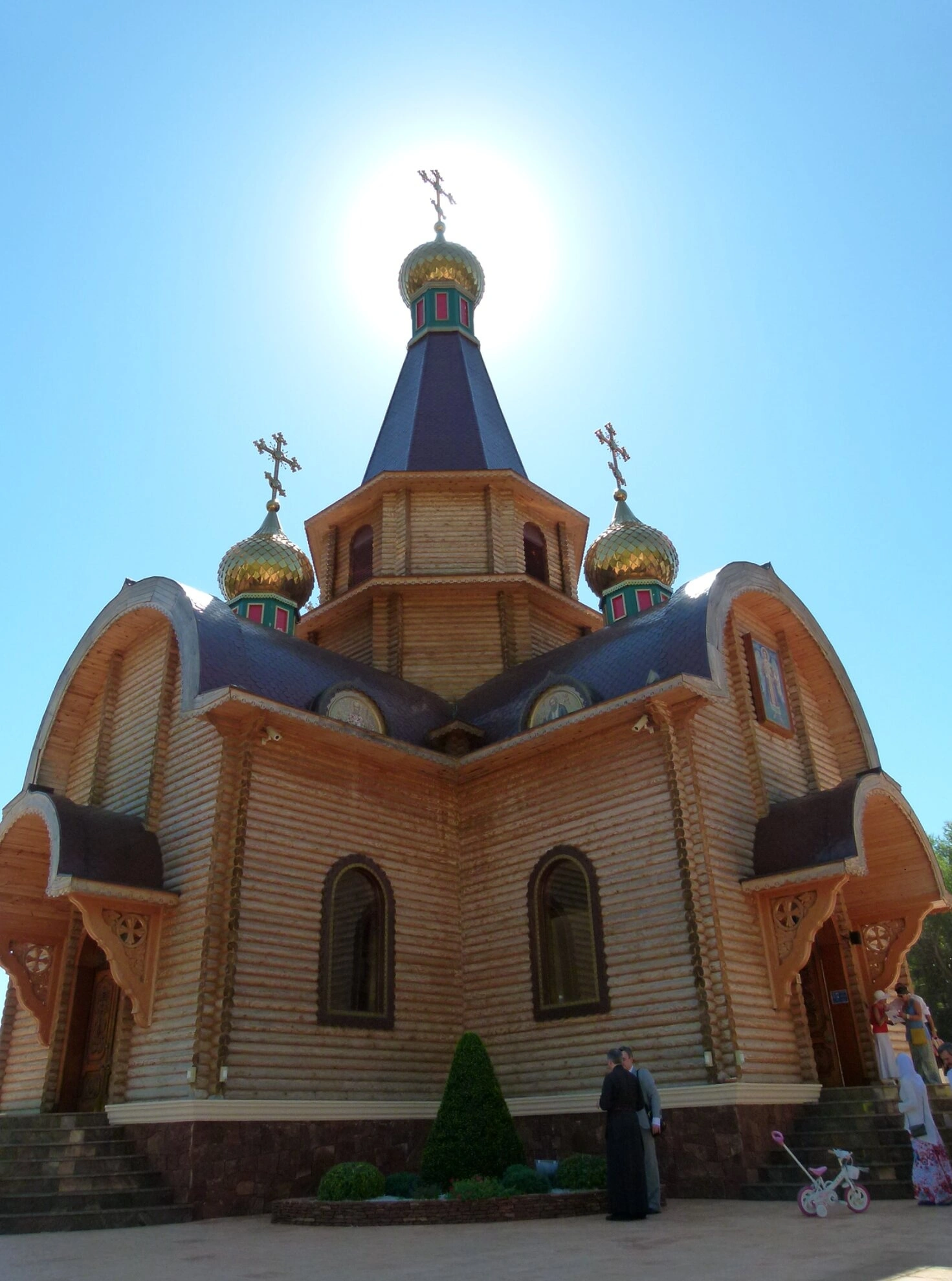 Здание храма представляет собой образец русского деревянного зодчества, возведённого с соблюдением канонов церковной архитектуры. На снимке хорошо видны характерные луковичные купола, увенчанные золочёными крестами, которые сияют под лучами средиземноморского солнца. Стены из оцилиндрованного бревна подчёркивают традиционный для Руси стиль постройки и создают ощущение преемственности вековых традиций православного храмостроительства.