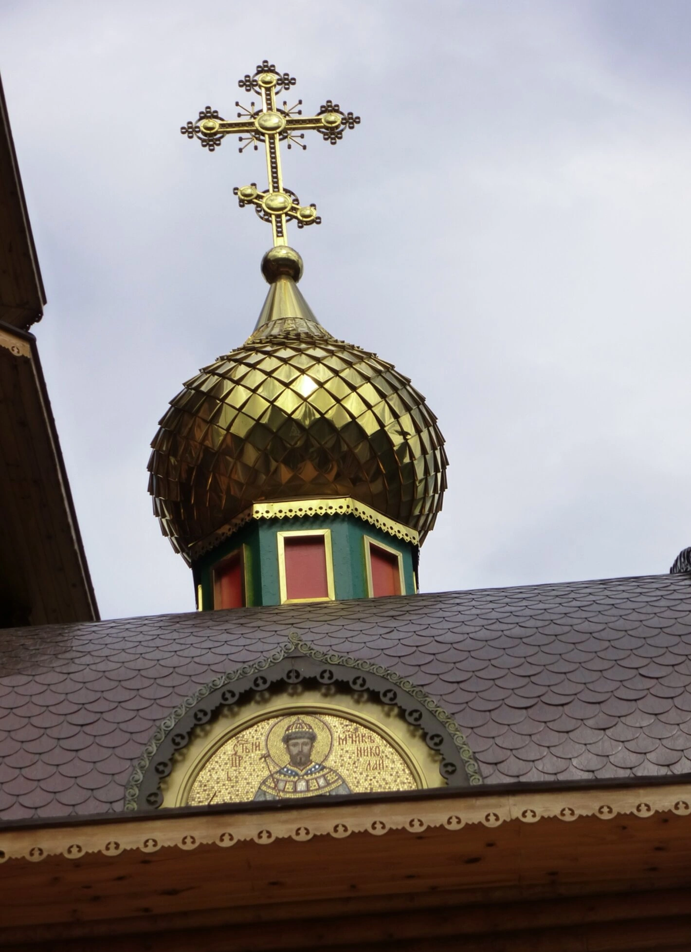 На фотографии запечатлён величественный купол русского православного храма в честь Святого Архангела Михаила, расположенного в испанском городе Альтея. Золотая глава, сияющая под южным солнцем, венчает собой дом молитвы и является символом Небесного Царства. Купол украшен традиционным орнаментом и увенчан восьмиконечным православным крестом, возносящимся в небо как знамение победы Христовой над смертью.