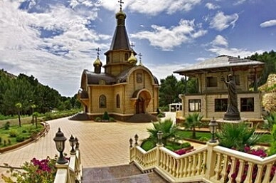 Белоснежные стены храма, увенчанные златоглавыми куполами с православными крестами, ярко выделяются на фоне средиземноморского пейзажа. Архитектурный ансамбль воплощает классический русский стиль с характерными кокошниками, узорчатыми карнизами и арочными оконными проёмами, что создаёт ощущение присутствия на русской земле.