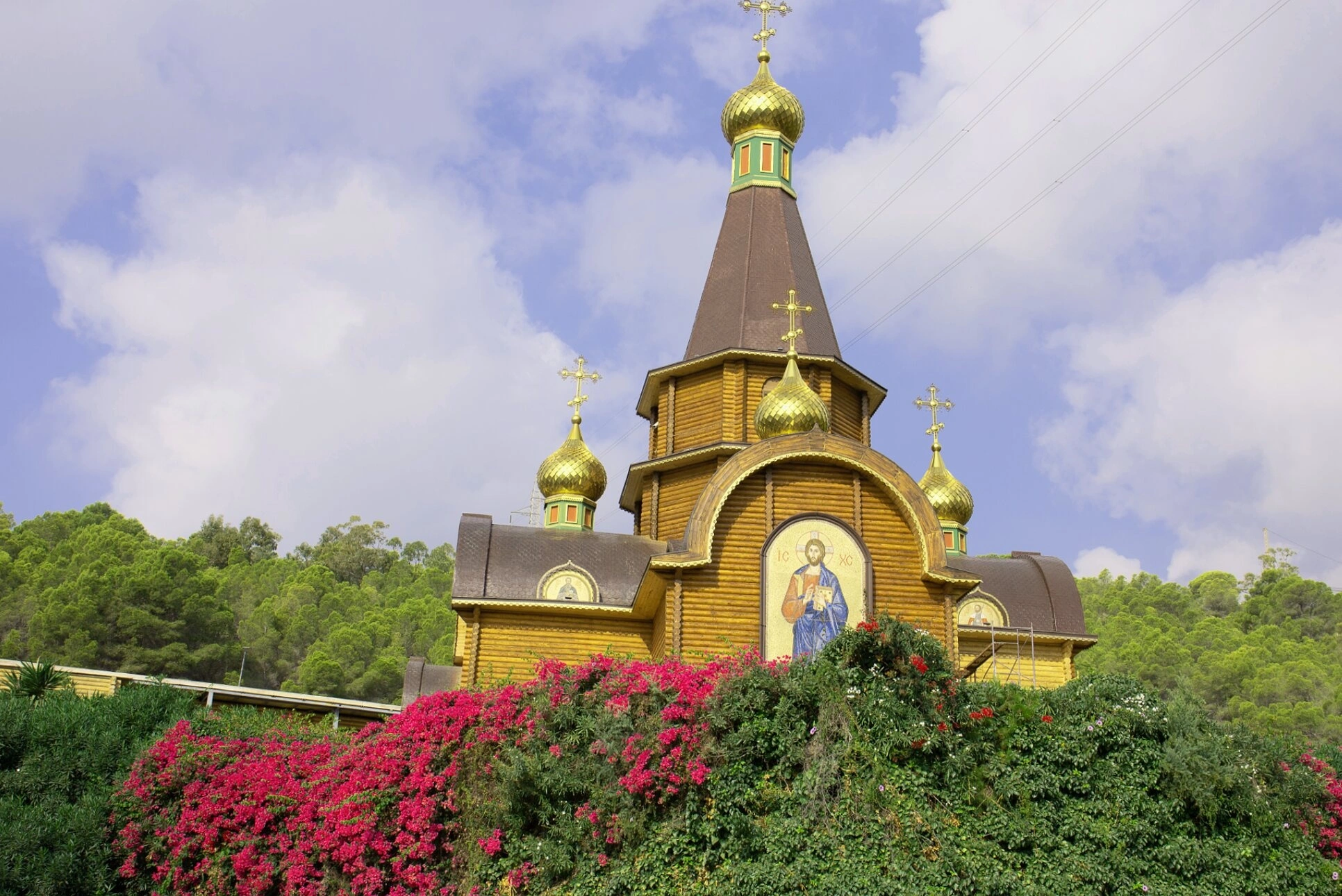 На фотографии запечатлён русский православный храм в честь святого Архистратига Божия Михаила, расположенный в испанском городе Альтея, в автономном сообществе Валенсия. Святыня находится на склоне холма в окружении средиземноморской растительности, что создаёт уникальный гармоничный образ, сочетающий духовную красоту православной архитектуры с живописным природным ландшафтом.