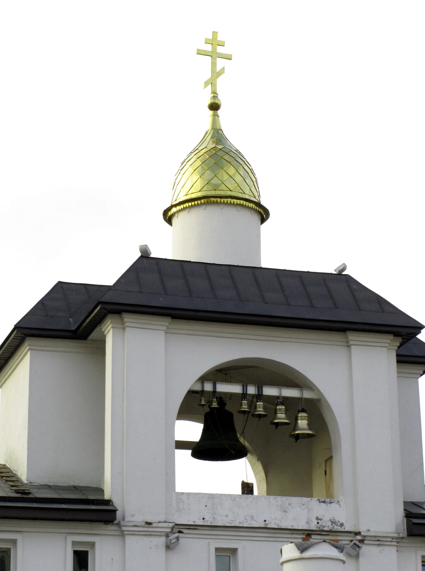 На представленной фотографии запечатлён фрагмент собора в честь святого благоверного князя Александра Невского, расположенного в городе Балашиха Московской области. В центре композиции возвышается величественный золочёный купол, увенчанный традиционным православным восьмиконечным крестом, сияющим в лучах дневного света. Под главкой располагается просторная арочная звонница, в которой размещены церковные колокола различного веса и назначения. Центральное место среди них занимает большой благовестный колокол, предназначенный для созыва верующих на богослужение.