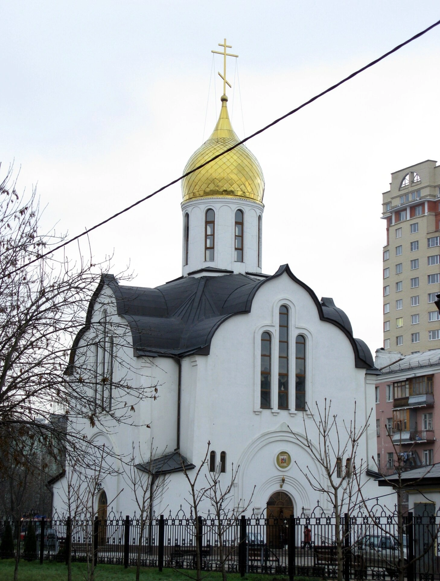 Храмовая территория благоустроена и ограждена аккуратным металлическим забором. На снимке, сделанном в осенне-зимний период, видны деревья с оголёнными ветвями, что подчёркивает строгую красоту православной святыни на фоне современного городского пейзажа. На заднем плане фотографии справа виден многоэтажный жилой дом, что указывает на расположение храма в черте города.