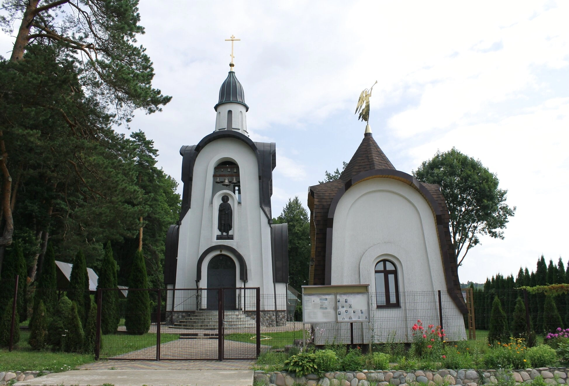 Архитектурный ансамбль включает в себя основной храм и отдельно стоящую колокольню, увенчанную золочёным куполом с крестом. Рядом располагается часовня, купол которой венчает фигура ангела, что придаёт комплексу особую благодатную лёгкость и устремлённость к небесам. Здания выдержаны в светлых, согревающих тонах, что символизирует Божественный Свет и чистоту православной веры.