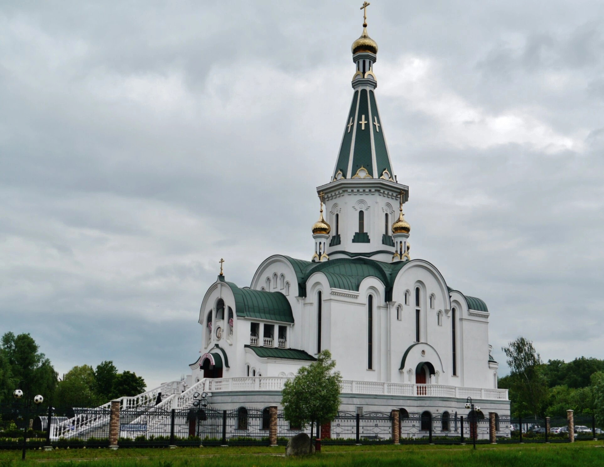 К парадному входу ведёт широкая каменная лестница с аккуратными белыми перилами, подчёркивающая значимость портала. Основание здания оформлено оградой-балюстрадой. Территория вокруг храма ухожена и огорожена невысоким чёрным металлическим забором. На переднем плане фотографии виден ровный зелёный газон, а вокруг растут деревья и кустарники, обрамляющие святыню живой рамкой. Слева от здания можно разглядеть элементы городского уличного освещения. Пасмурная погода с серыми облаками на небе придаёт снимку особое настроение, а яркий бело-золотой облик храма светоносно выделяется на этом фоне, символизируя нетварный свет веры.
