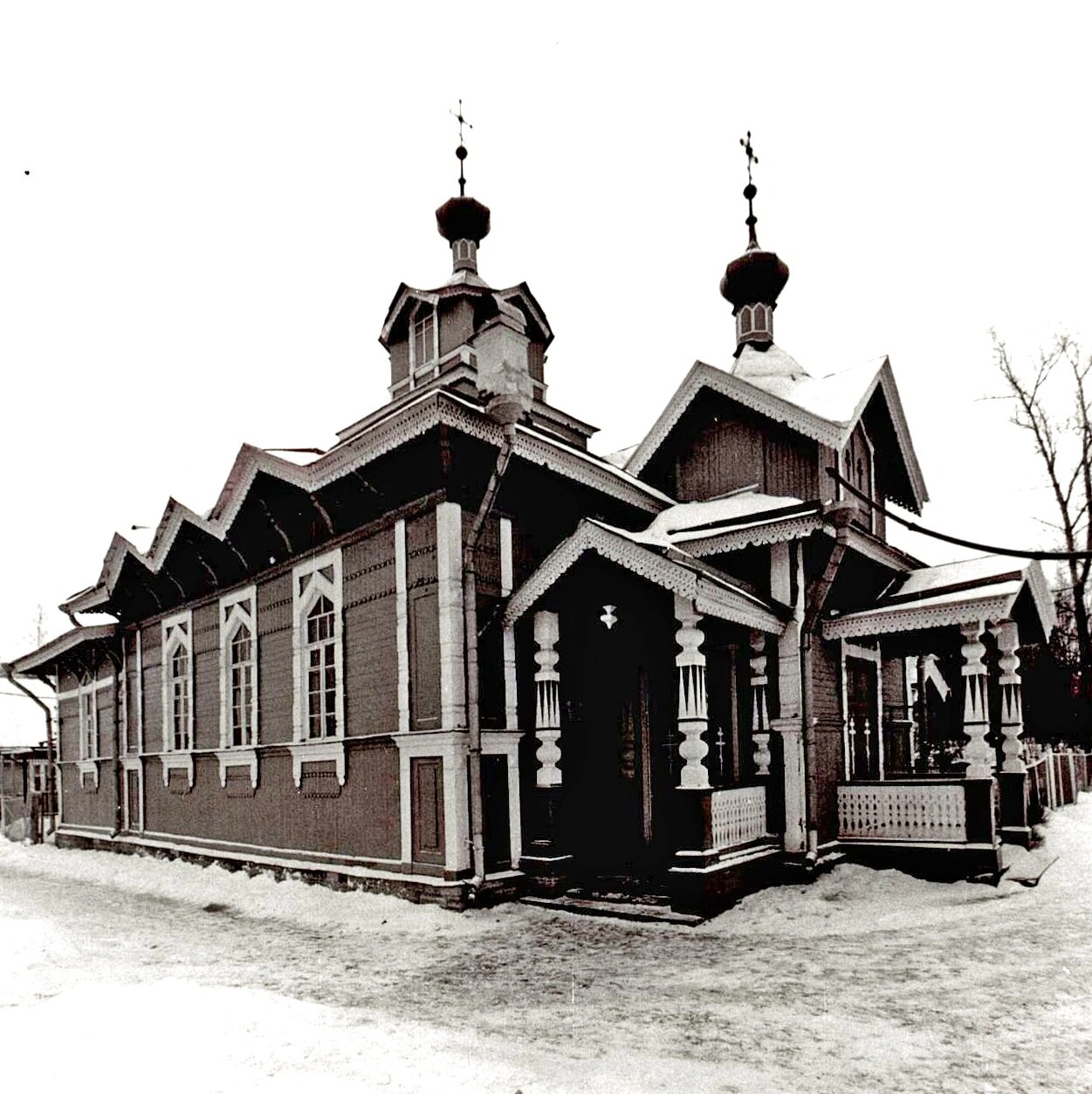 Храм увенчан главками, над которыми возвышаются золочёные кресты, символизирующие победу над грехом и смертью. Фасад украшен резными деталями, придающими строению лёгкость и изящество, а крыльцо с навесом гостеприимно встречает каждого прихожанина. Чёрно-белое исполнение фотографии подчёркивает историческую ценность объекта и его вневременную духовную значимость.