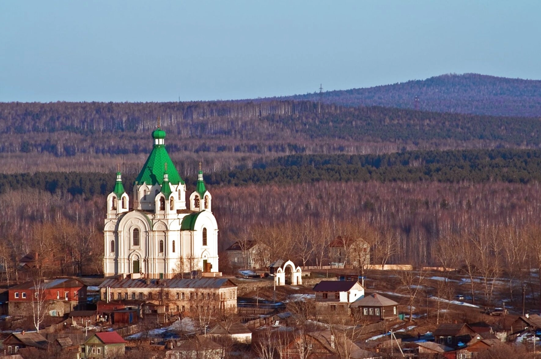 На переднем плане и по сторонам от храма виднеются жилые дома, что подчёркивает неразрывную связь духовной жизни с повседневным бытием горожан. На заднем плане открывается вид на бескрайний уральский лес, уходящий вдаль по склонам холмов. Деревья, изображённые без листвы, позволяют предположить, что съёмка велась в преддверии зимы или ранней весной.