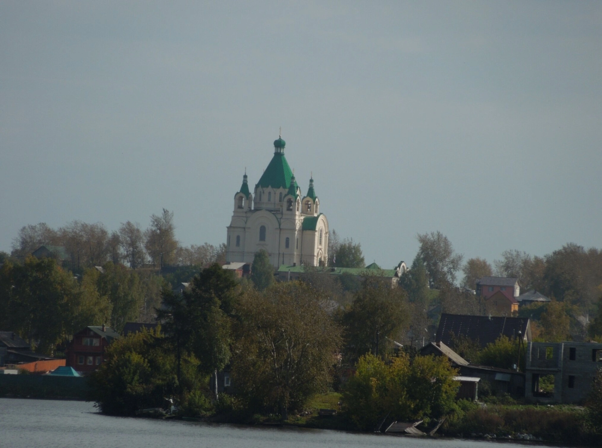 На представленной фотографии запечатлён величественный храм во имя святого благоверного великого князя Александра Невского, расположенный в живописном месте на берегу Выйского пруда в городе Нижний Тагил. Святыня, возвышающаяся над окружающими деревьями и жилыми домами, является одним из духовных центров города и выдающимся памятником православной архитектуры Урала.