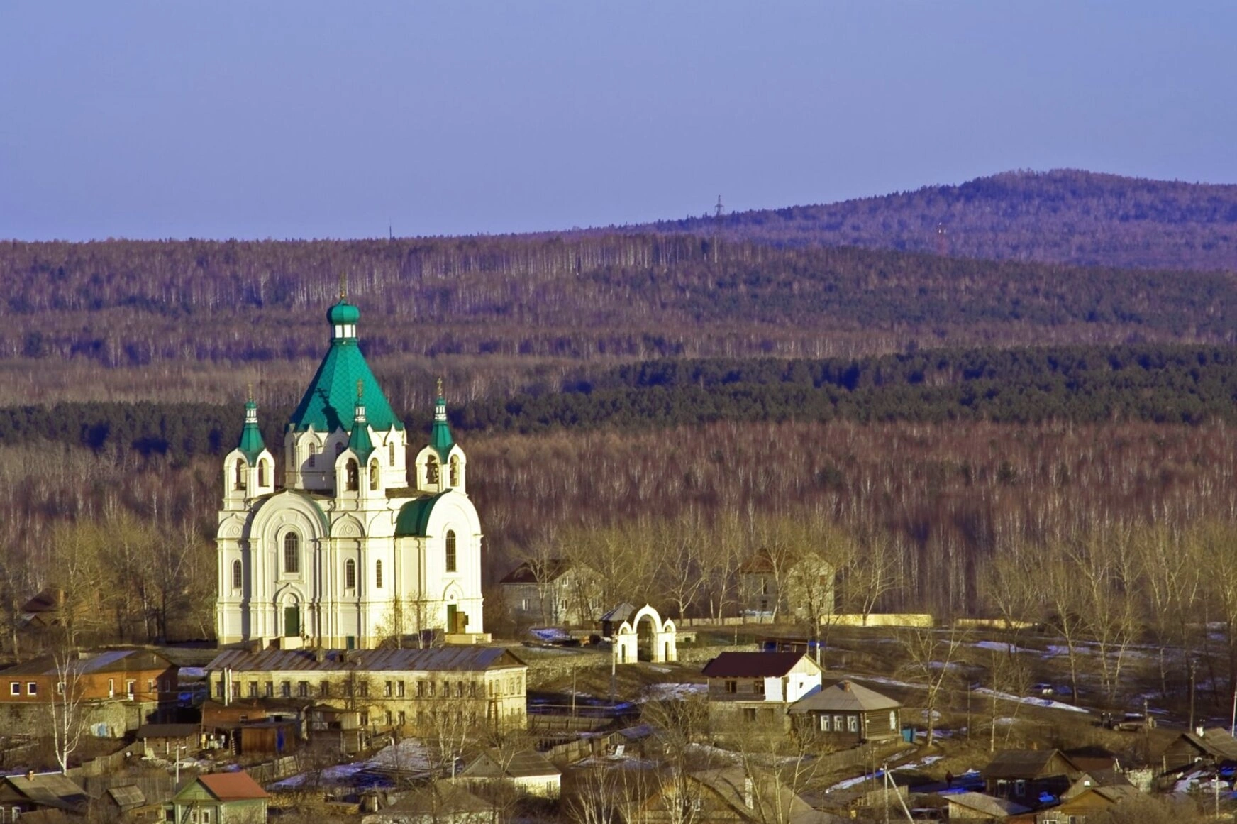 На заднем плане открывается вид на бескрайний уральский лес, простирающийся до подножия гор. Данный пейзаж, характерный для осеннего или ранневесеннего периода, придаёт фотографии особую строгую красоту и ощущение умиротворённого покоя. Чёткие тени от стен храма, отбрасываемые ярким дневным светом, подчёркивают изящество архитектурных линий и рельеф местности, создавая игру света и тени.