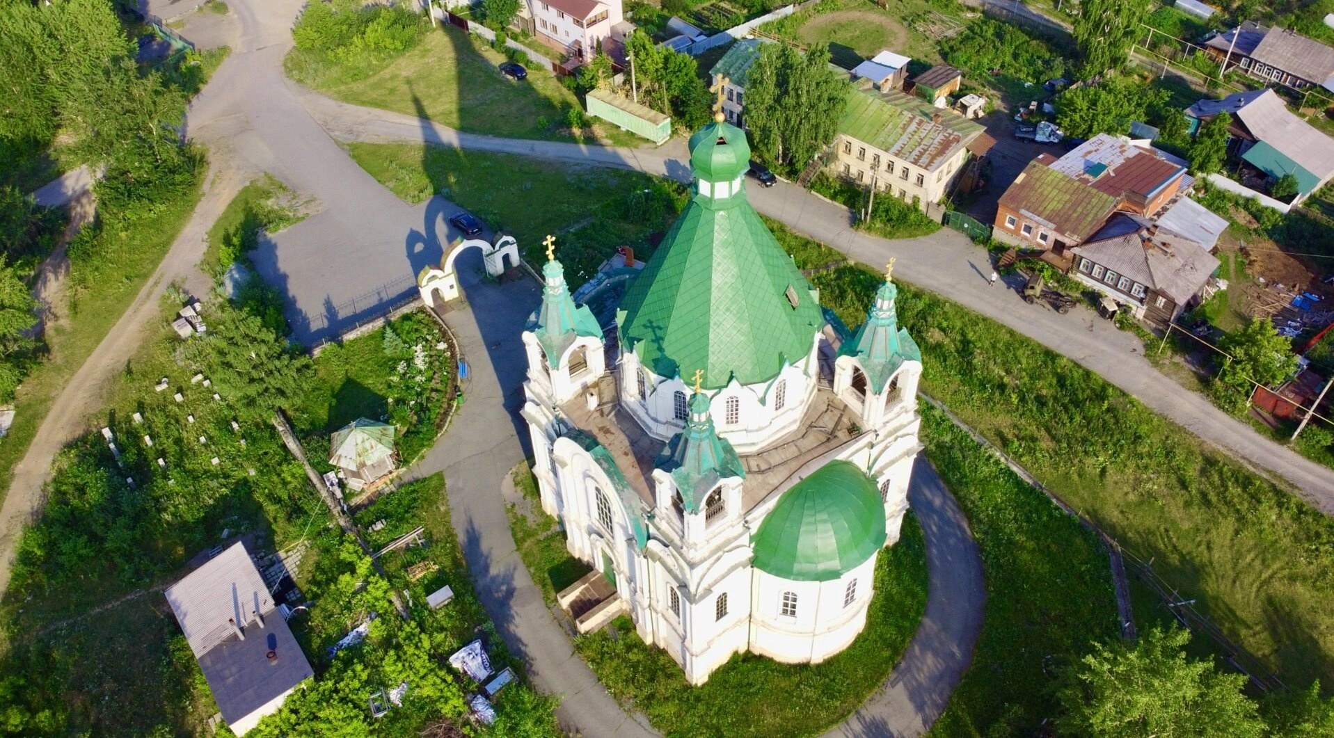 На представленной фотографии запечатлён величественный вид храма во имя Святого Благоверного князя Александра Невского, что располагается в городе Нижний Тагил. Снимок выполнен с высоты птичьего полёта, что позволяет в полной мере оценить симметрию и гармонию церковной архитектуры, а также её органичное вписывание в окружающий ландшафт.