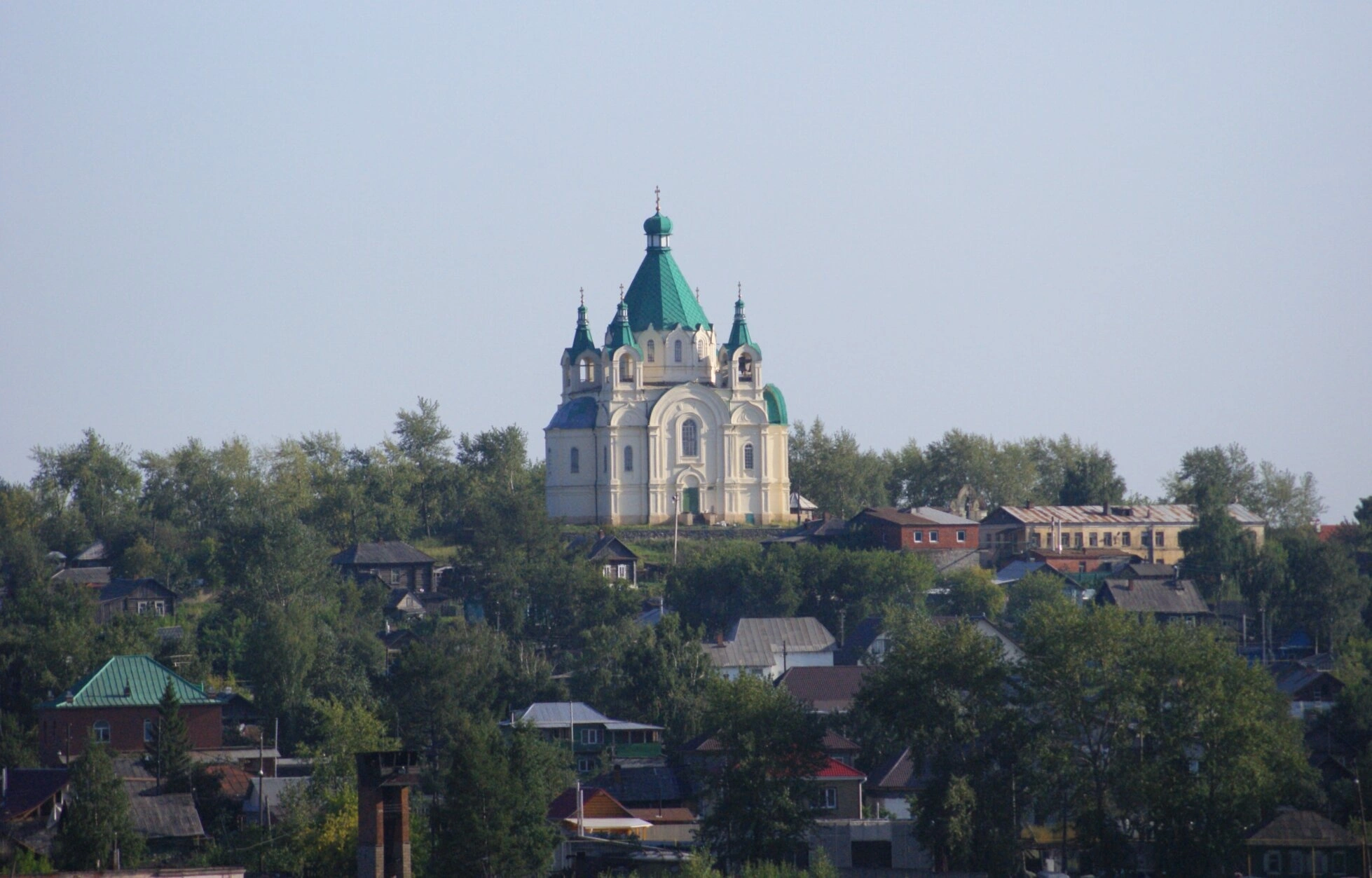 На представленной фотографии запечатлён величественный храм во имя святого благоверного великого князя Александра Невского, располагающийся в городе Нижний Тагил. Святыня живописно возвышается на склоне, доминируя над окружающим городским пейзажем и символизируя духовное возвышение над мирской суетой.