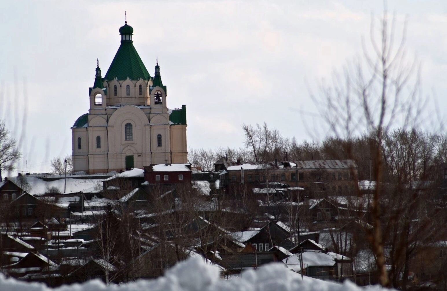 На представленной фотографии запечатлён величественный храм во имя святого благоверного великого князя Александра Невского, находящийся в городе Нижний Тагил. Святыня возвышается на холме, доминируя над окружающим городским пейзажем, что символизирует её духовное значение для православных верующих. Зимнее убранство придаёт архитектурному ансамблю особую, возвышенную красоту и строгость.