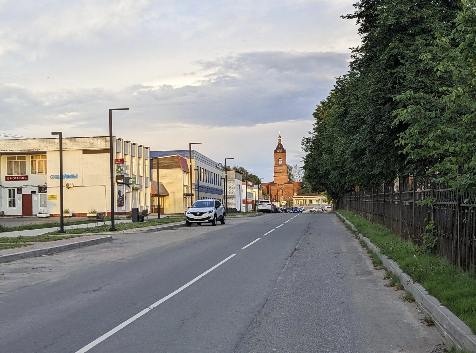На переднем плане фотографии видна благоустроенная асфальтированная дорога с разметкой, по обеим сторонам которой расположены городские постройки. Слева от дороги находится здание с вывеской «Нотариус», справа — зелёная зона с деревьями и ограждением. Припаркованные автомобили свидетельствуют о современной жизни города, органично сочетающейся с историческим наследием.