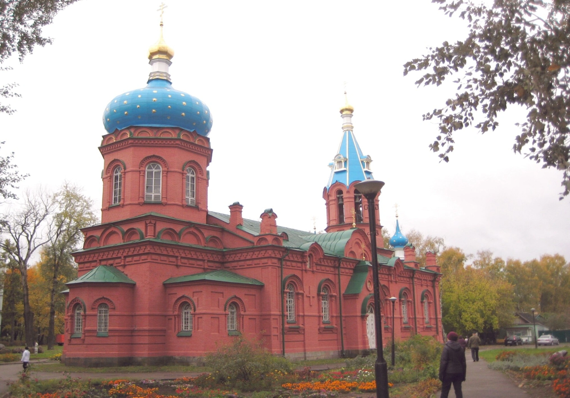 Святыня располагается на ухоженной территории, где высажены цветочные клумбы с яркими оранжевыми цветами и деревья, начинающие желтеть в раннеосенний период. На переднем плане фотографии видны две фигуры прихожан, прогуливающихся по храмовой дорожке, что добавляет снимку ощущение мирной и спокойной атмосферы православной обители. Небо в этот день затянуто облаками, что характерно для поры бабьего лета и создаёт мягкое, рассеянное освещение, подчёркивающее благолепие святого места.
