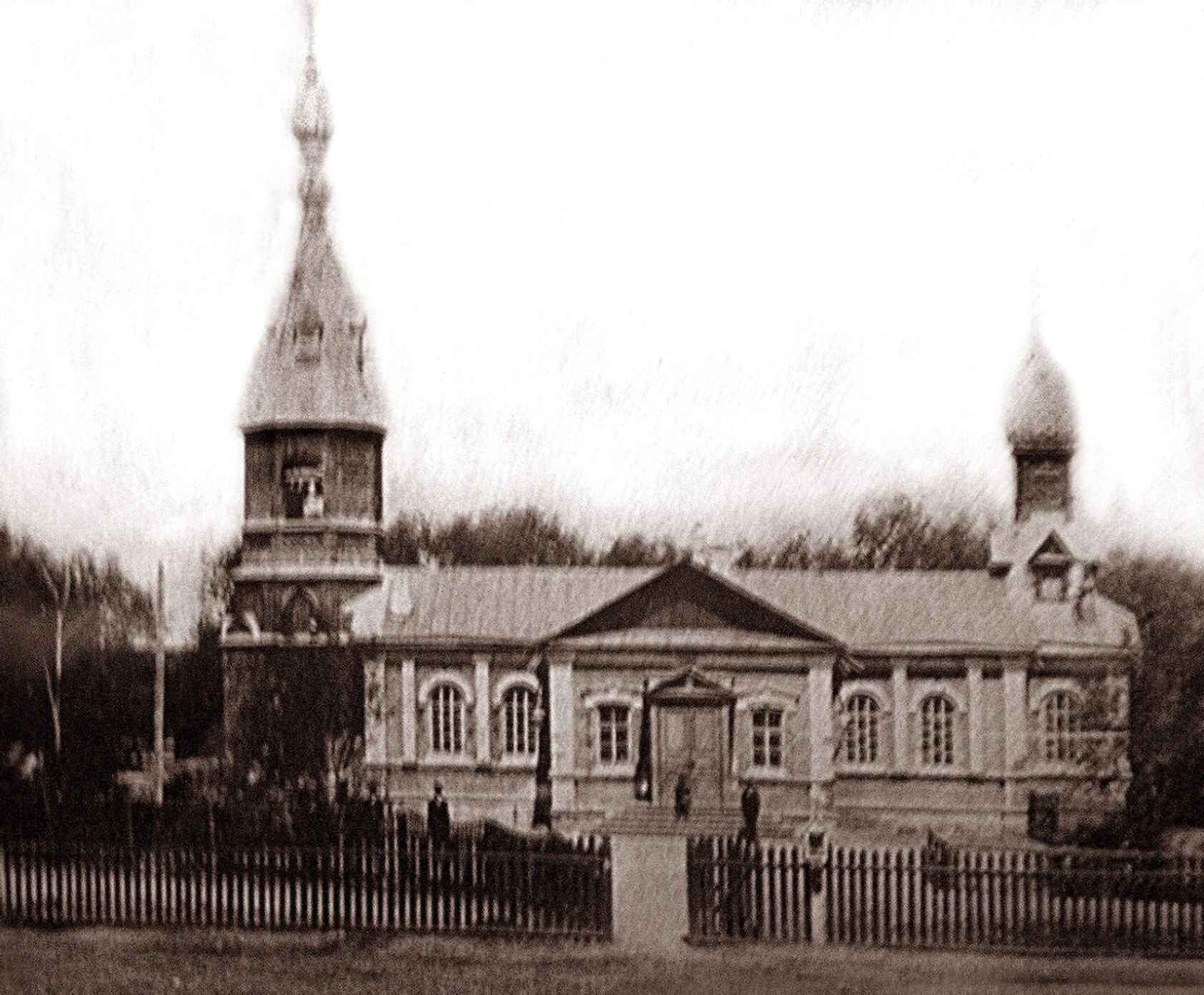 На исторической фотографии запечатлена Александро-Невская церковь, расположенная в городе Ртищево Саратовской области. Этот деревянный православный храм был освящён во имя святого благоверного великого князя Александра Невского.